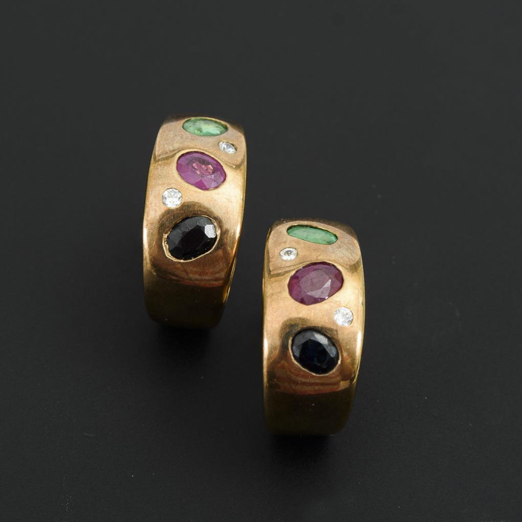 Halbcreole mit eingelassenem Smaragd, Rubin, Saphir und 2 kleinen farblosen Steinen. Steckmechanik.