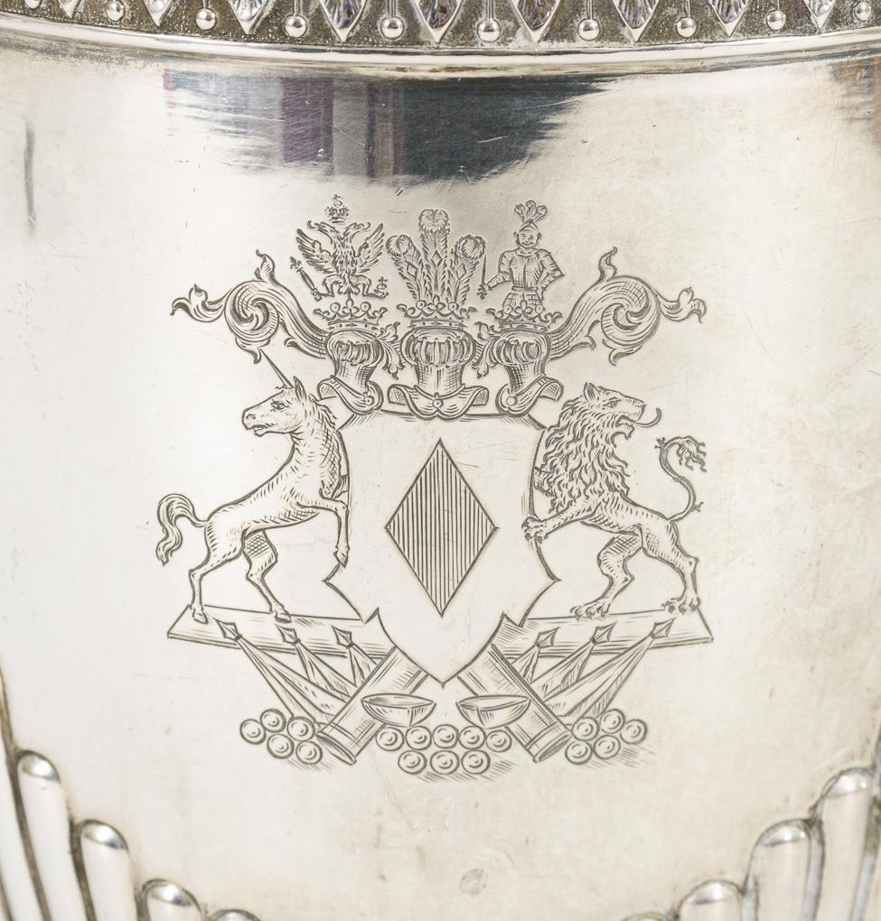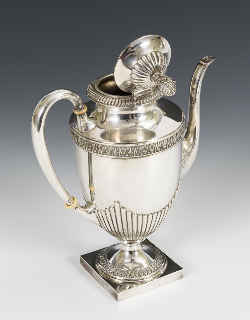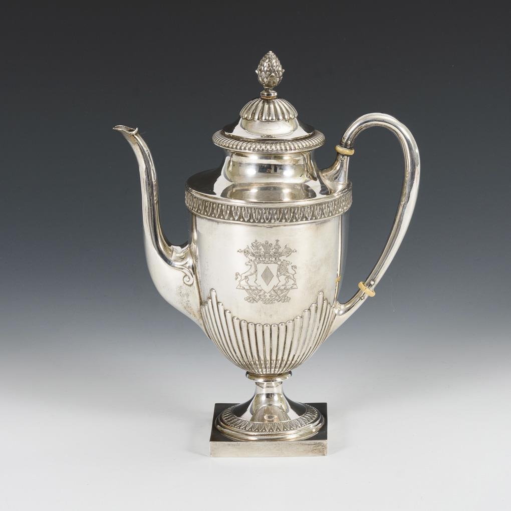 Im Stil des Klassizismus mit Zungenbändern und Pinienknauf gestaltet. Jeweils graviertes Wappenschild mit Einhorn und Löwe. Kanne an der Plinthe minimal gedellt.
