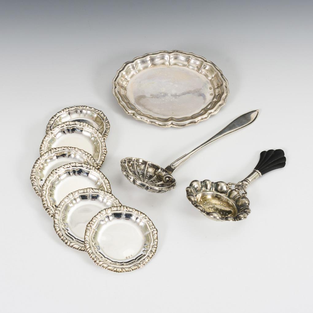 2 Schaumlöffel, 6 Untersetzer mit Kordelrand und kleines Ovaltablett. Gebrauchsspuren.