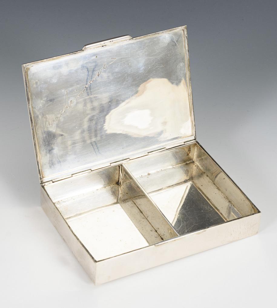 Glatte Schatulle mit Innenteilung und Besitzergravur auf der Deckelinnenseite. 2 Seiten minimal gedellt, innen Kratzer.