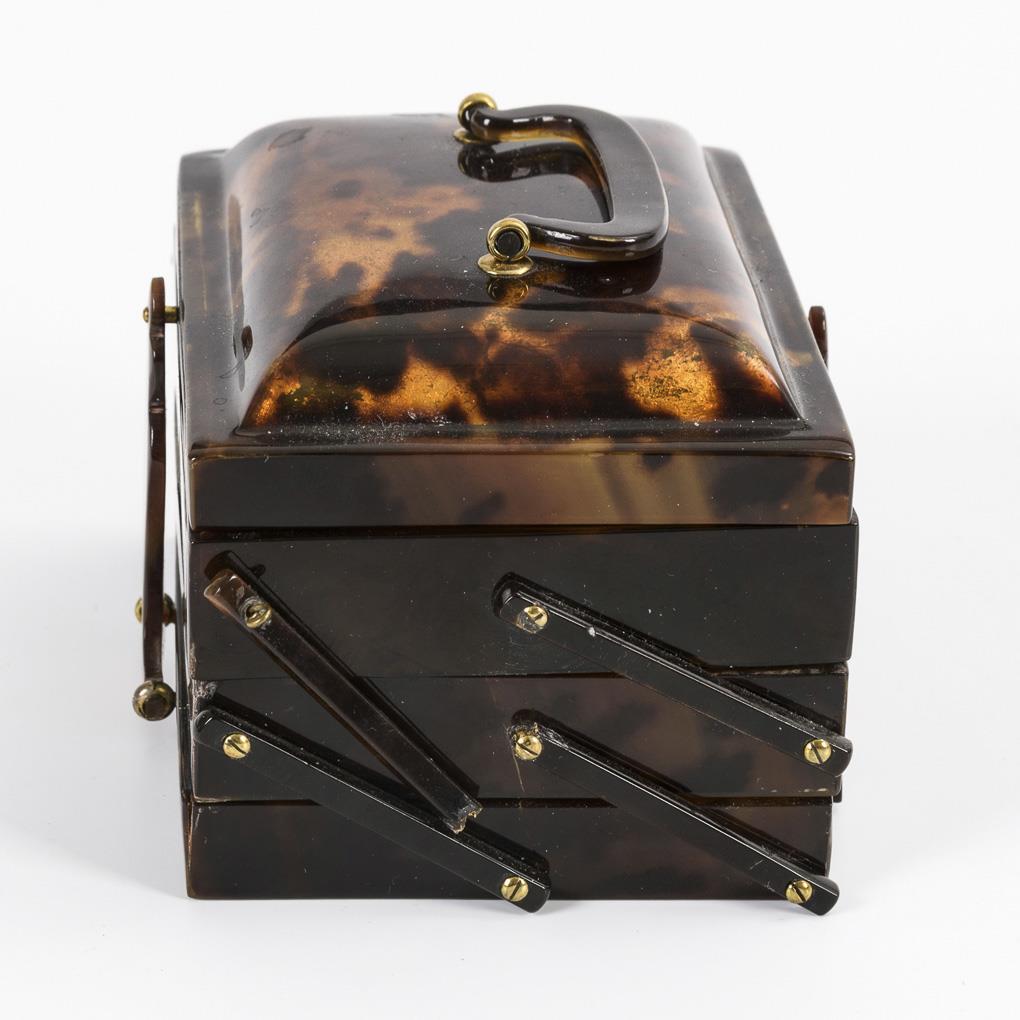 Ausfächernd aufklappbare Quaderschatulle aus 3 Fächern mit Scharnierdeckel. Innen 2 Broschen, 2 Ringe und 2 gleiche Zierscheiben aus Schildpatt. 1 Scharnierstrebe gebrochen..