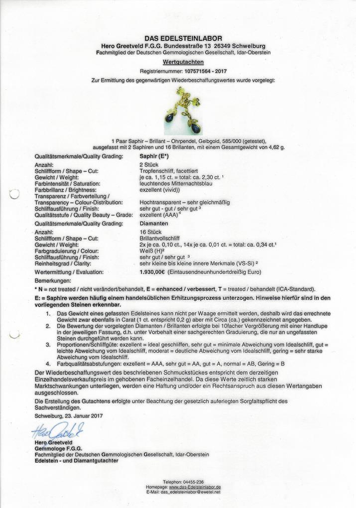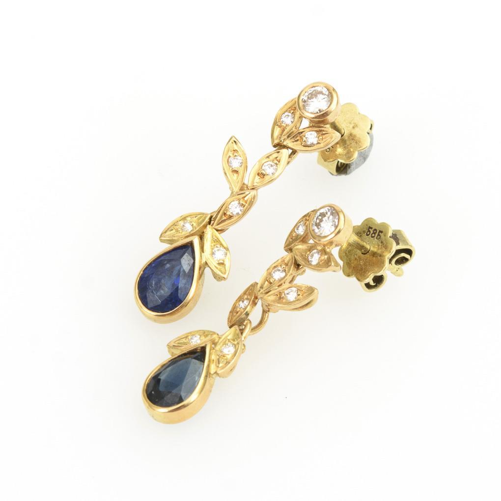 Gelbgold 585 gestempelt, geprüft. Brillanten gesamt ca. 0,34 ct. Saphire gesamt 2,3 ct. L 2 cm. 4,6 g.