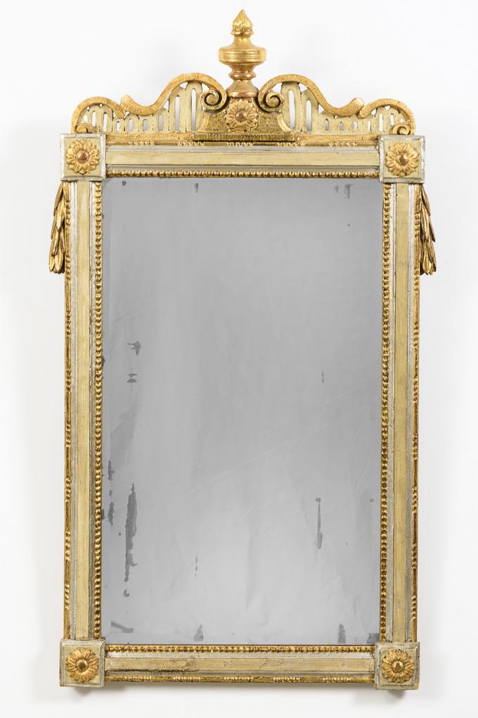 Original-verglaster, rechteckiger Wandspiegel mit à jour gearbeitetem Giebel und Urnenbekrönung, Rahmen mit Perlstabverzierung und Rosettenschnitzerein in den Ecken. Alters-/Gebrauchsspuren, Glas mit Flecken.