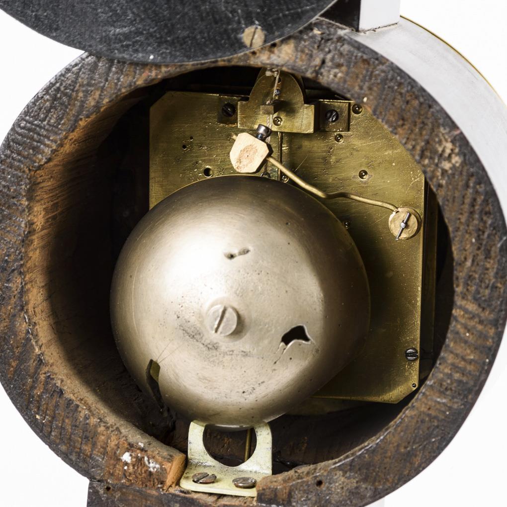Ungemarktes Werk mit Halbstundenschlag auf Glocke, Fadenaufhängung. Läuft. Weißes Emailzifferblatt mit arabischen Zahlen, Minutenkranz und Speerzeigern.