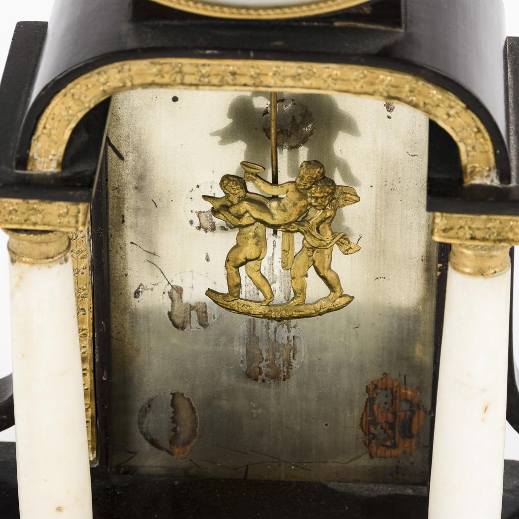 Geschweifter Sockel mit 2 glatten Alabastersäulen, verspiegelter Rückwand und bekrönendem Uhrwerk mit kleinem Vasenaufsatz. Alters- und Gebrauchsspuren, Defekte, ergänzte Glocke.