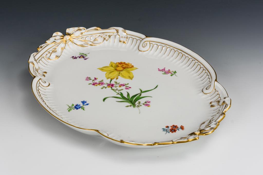 Ovale Form mit Schleifenhandhaben. Im Spiegel ein Blumenbukett mit Narzisse.