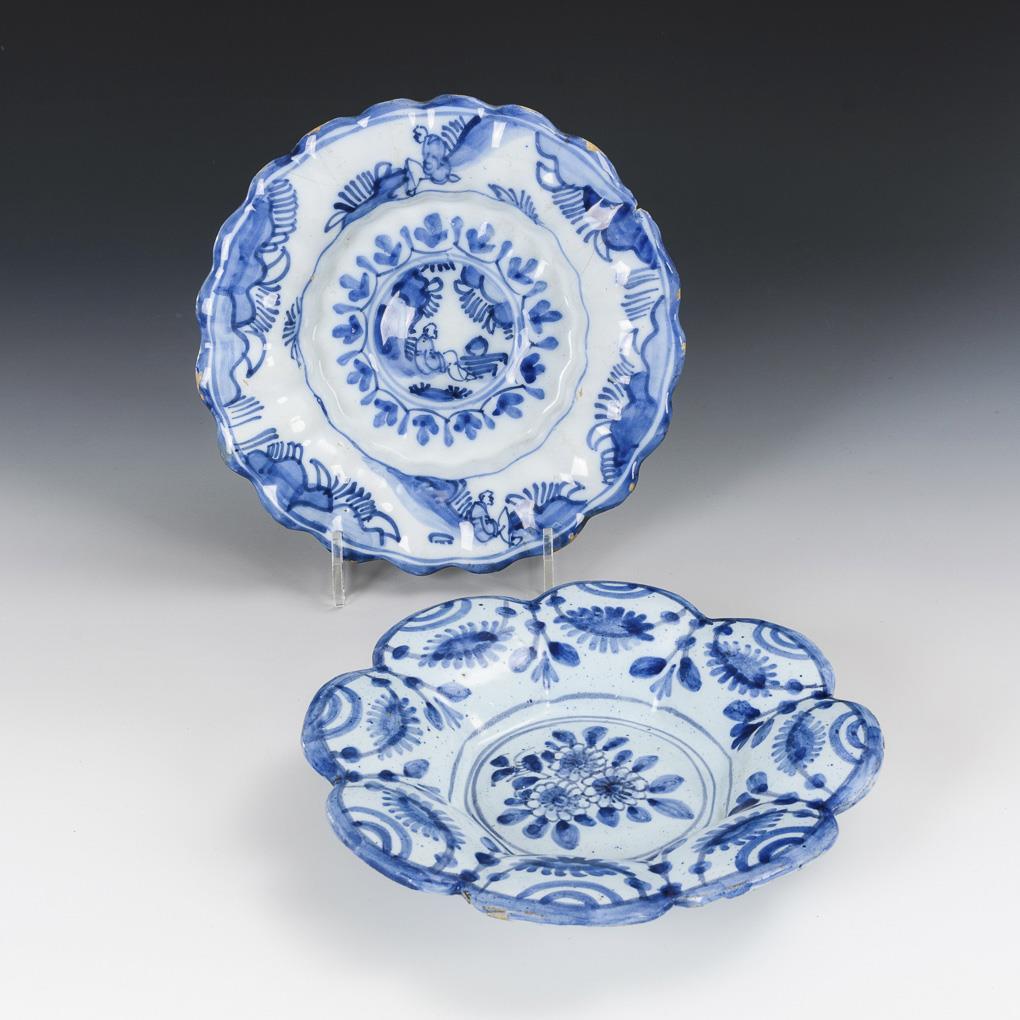 8-fach gebuckelte Schale mit Blumenmalerei (Ø 22,5 cm), Schale mit geripptem Rand und Chinoiserien (Ø 21 cm). Jeweils mit Rissen und leichten Bestoßungen.