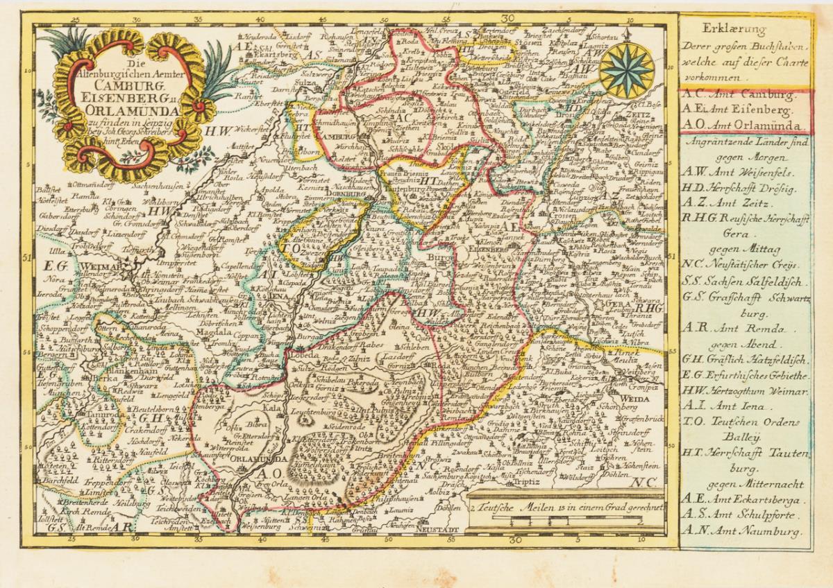Detailreiche Karte der "Altenburgischen Ämter Camburg, Eisenberg und Orlamünde [...]". Beschnitten, etwas stockfleckig.