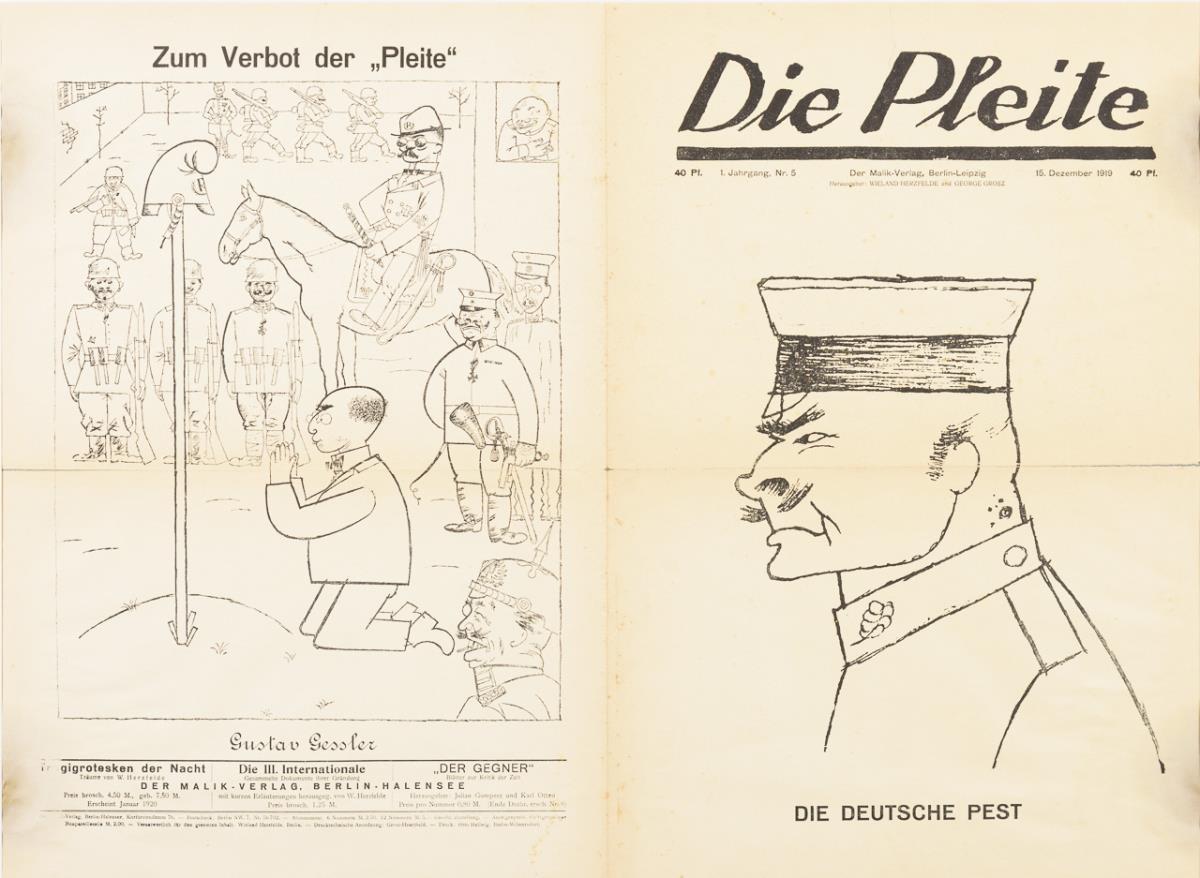 Deckblatt der Satirezeitschrift "Die Pleite" - recto: "Die deutsche Pest", verso: "Zum Verbot der Pleite", 1. Jahrgang, Nr. 5, 15. Dezember 1919, herausgegeben von Wieland Herzfelde und George Grosz. Mehrfach gefaltet, Faltungen teils mit Rissen, etwas stockfleckig.
