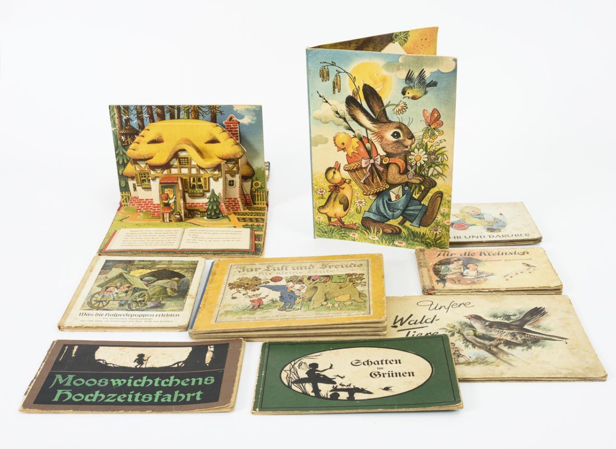 Fritsche, Veronika mit Versen von Gerhard Burkhardt: "Ein Jahr und darüber", Dr. Herbert Schulze Buch- und Kunstverlag Nachf., 1950. / "Mooswichtchens Hochzeitsfahrt. Ein Waldmärchen mit Bildern nach Scherenschnitten von Hedwig Pelizaeus", Verlag von J. Neumann, Neudamm, 24 Seiten mit Scherenschnittbildern. / Pelizaeus, Hedwig/Müller-Liebenwalde, J.: "Schatten im Grünen. Lustige Scherenschnitte mit Reimranken für kleine und große Kinder", Verlag von J. Neumann, Neudamm, teils ganzseitige Scherenschnittbilder. / "Zur Lust und Freude für kleine Leute", Verlag von A. Anton u. Co. , Leipzig, Farblithographien. / Kretzschmar, Georg/Klinkhardt, Mia: "Unsere Waldtiere", Unger-Verlag, Pößneck, 1953. / "Für die Kleinsten. Ein Lieder-Bilderbuch", 7 Farblithographien. / Huwe, Lotte/Wolff von Ponickau, Hans: "Was die Kasperlepuppen erlebten", Kunstverlag von Bischof & Klein, Lengerich i. Westf., 46 Seiten mit Grafiken. / "Rotkäppchen", Entwurf und Bilder von Vojtech Kubasta, Artia Verlag, Prag, 1959, 7 Seiten mit Pop-up-Bildern. / Kubasta: aufklappbare Pop-up-Tafel mit einem Hühnerstall, Osterhasen, Fröschen etc. Alle mit Gebrauchsspuren, teils mit Kinderzeichnungen und Defekten.