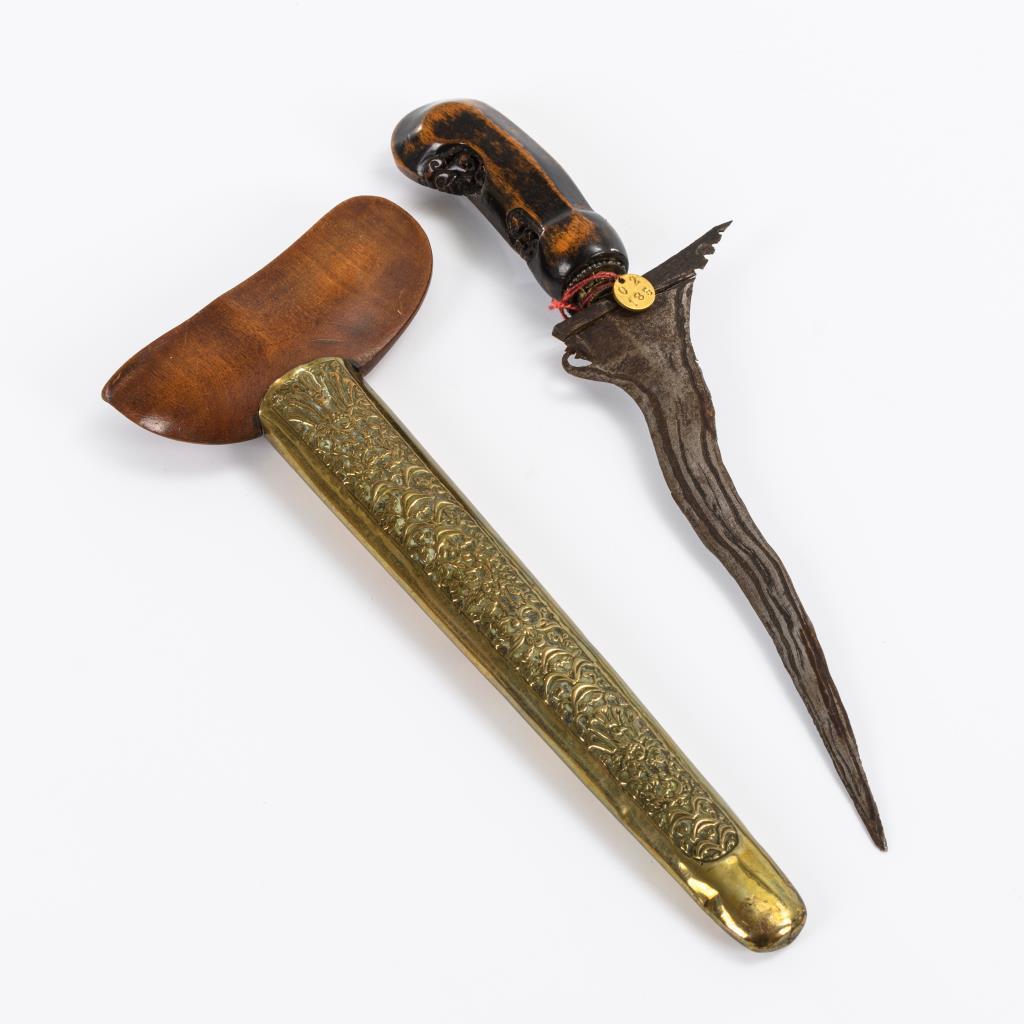 Gewellte, zweischneidige Klinge. Fein getriebene Messingscheide. Zwei Masken auf dem Holzgriff.