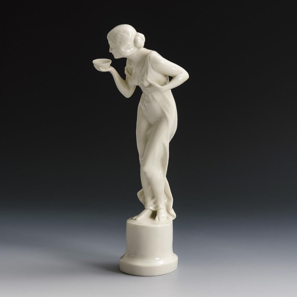 Auf einem Postament stehende, aus einer Schale trinkende junge Frau.