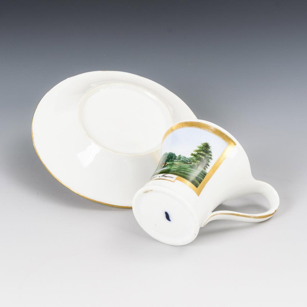 Polychrom bemalt, goldstaffiert. H Tasse 8,5 cm, Ø ergänzte Untertasse 14,5 cm.
