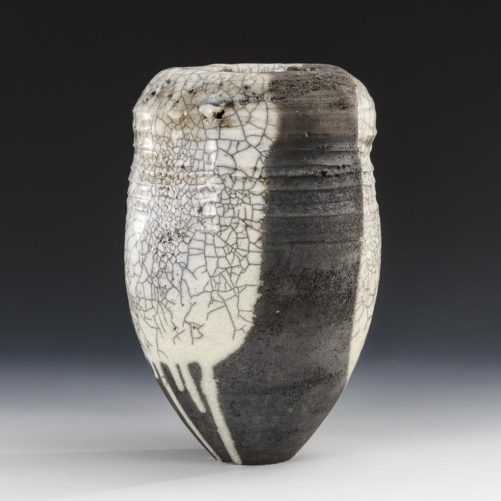 Gedrehter, anthrazitfarbener Scherben, weiße Engobe mit dunklem Krakelee. H 29,5 cm.