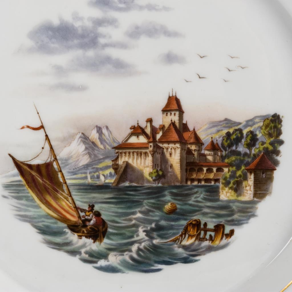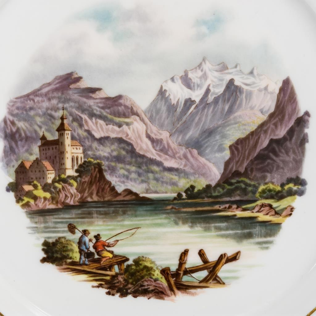 Dessertteller mit Spitzbogendurchbrüchen auf der Fahne. Im Spiegel eine alpine Landschaft, unterseitig bezeichnet "Chateau Chillon a. Genfer See" bzw. "Der Monte Rosa v. Vispach aus".