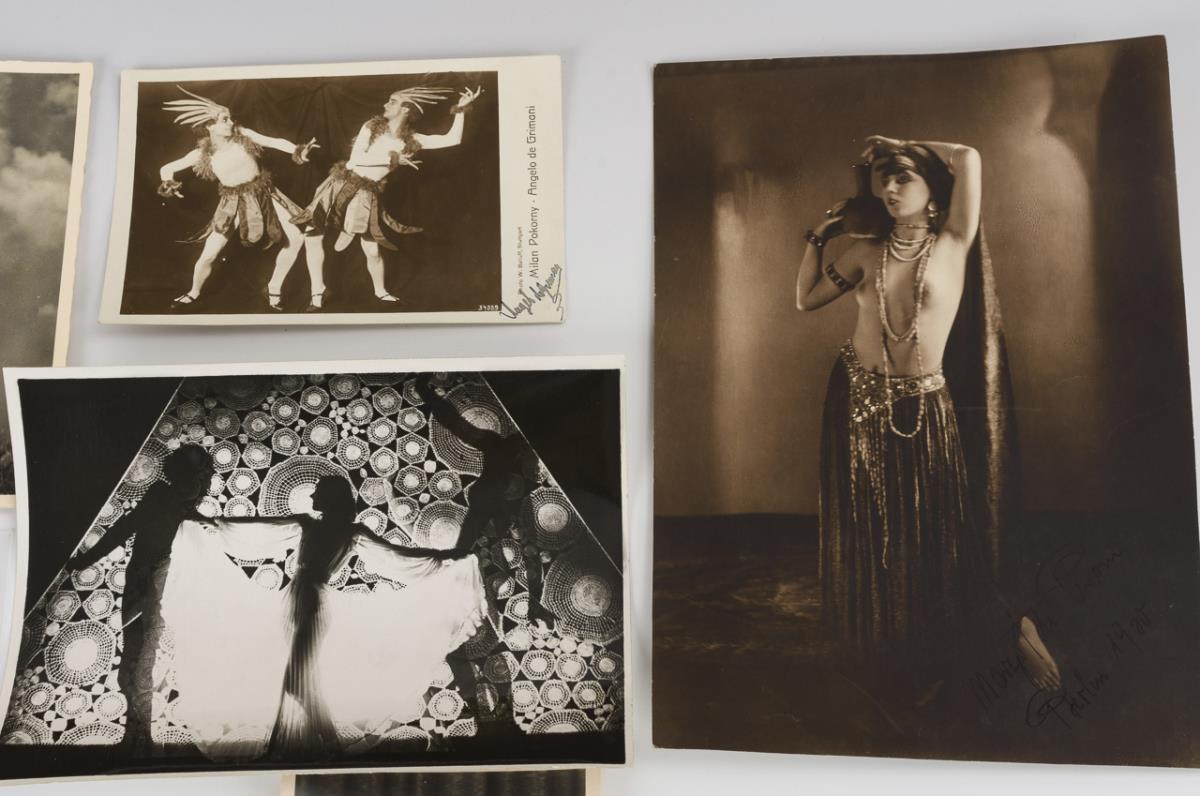 Darunter ein Autogramm der Margot di Pisoni, Berlin 1980; eine Fotografie der norwegischen Ballerina und Schauspielerin Vera Zorina (1917 - 2003), eine Fotografie der Universum-Film Aktiengesellschaft zu "Das Deutsche Filmballett - Gisela Deege", ein Autogramm des griechischen Tänzers Angelo di Grimanis sowie verschiedene Aktstudien. Alters- und Gebrauchsspuren.