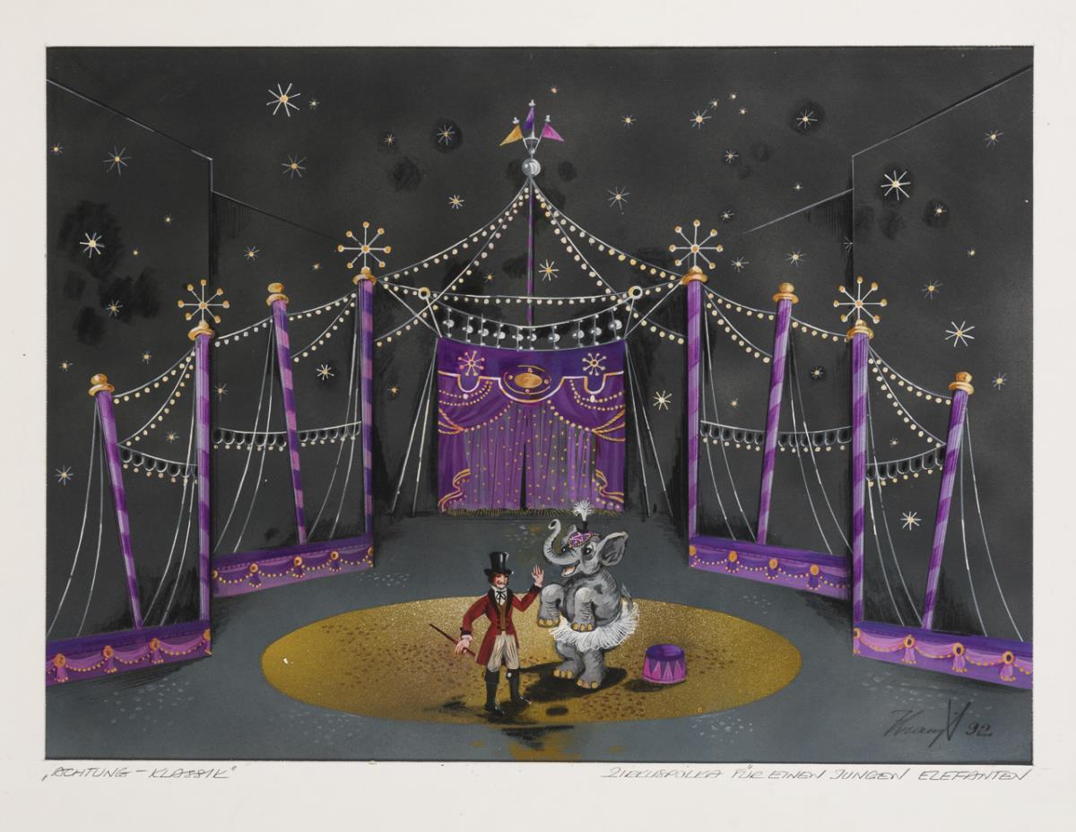 Darstellungen zu "Zirkuspolka für einen jungen Elefanten", "La Boutique Fantastique" und ein Bühnenbild mit tanzenden Damen.