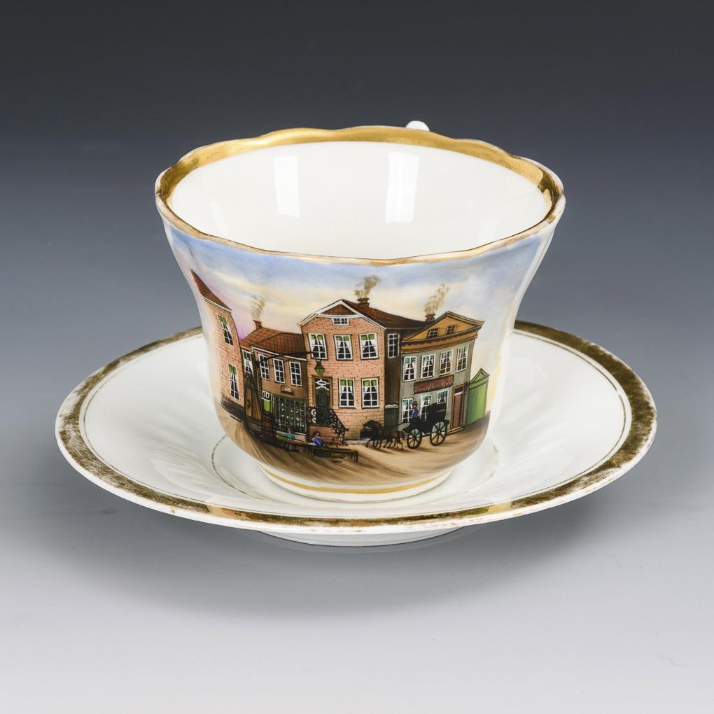 Glockentasse mit Ohrenhenkel. Schauseitig die Ansicht eines Dorfplatzes mit Brunnen sowie einer Kutsche vor einer Gaststätte namens "Deutsches Haus". Gold berieben, minimale Bestoßung am Untertassenrand.