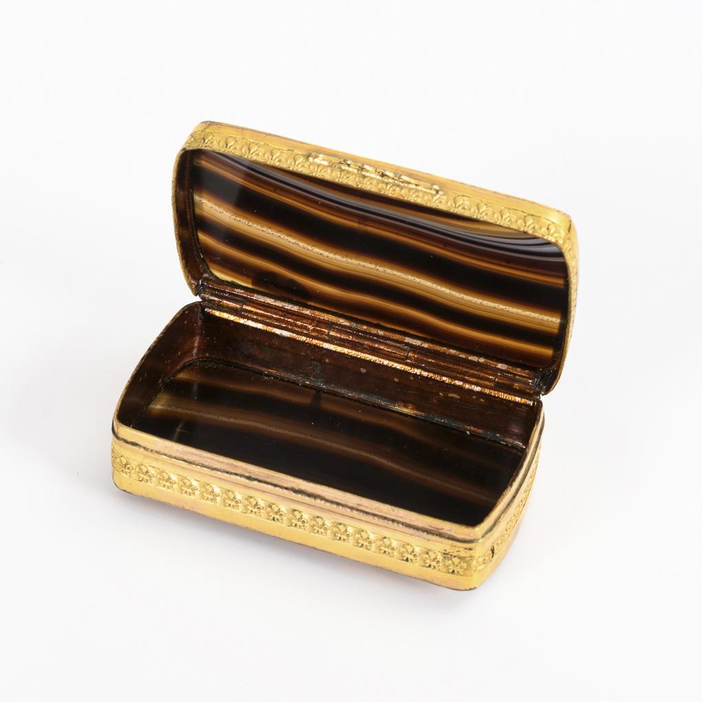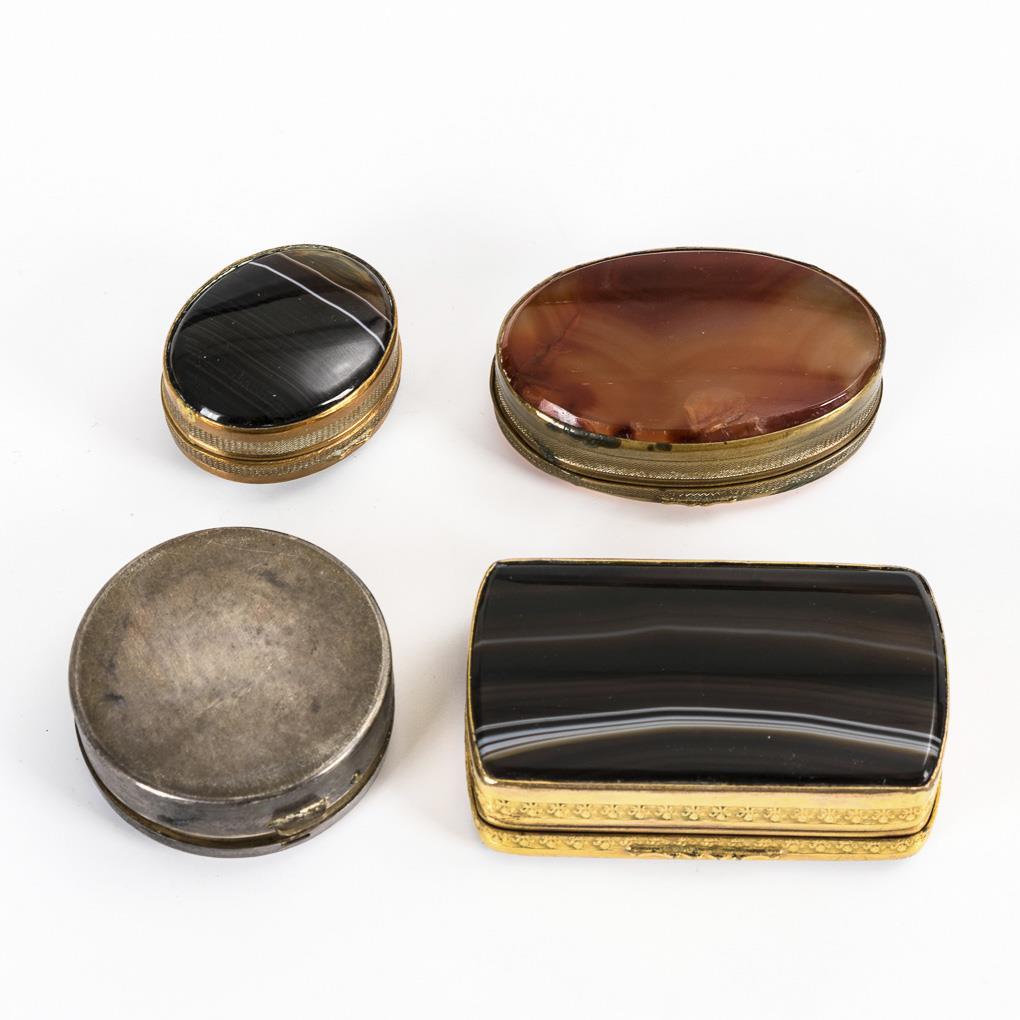3 Dosen mit feinen Friesen an der Messingwandung; diese auch mit Achatboden. Innen weiß lackierte, versilberte Dose mit Achatdeckel. 1 minimaler Haarriss, einige wenige Alters-/Gebrauchsspuren.