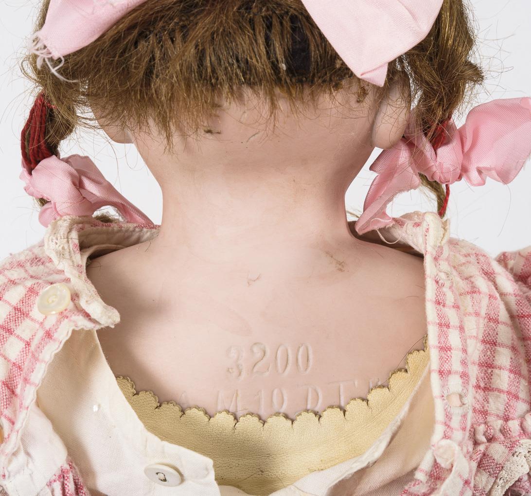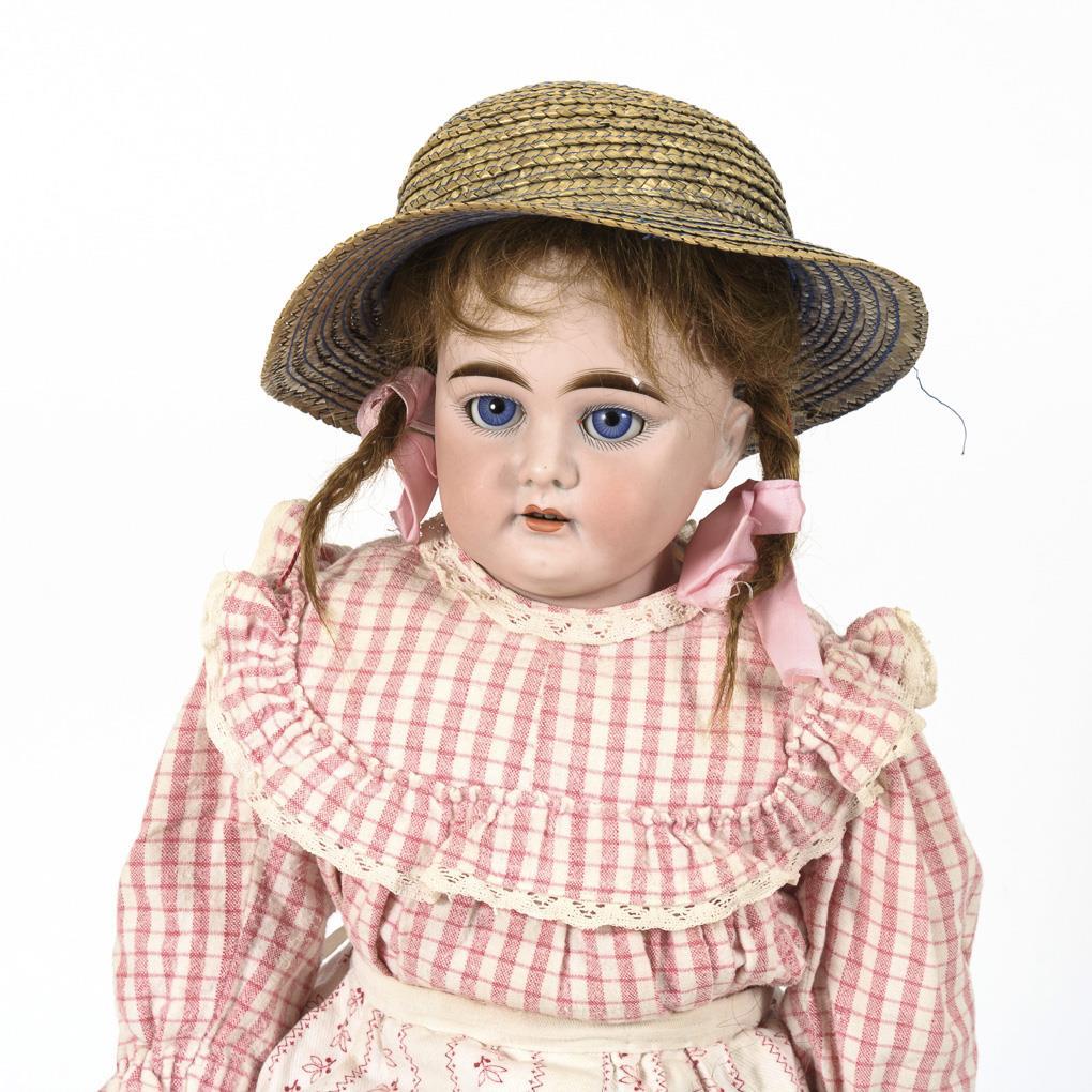 Blaue Schlafaugen, offener Mund, blonde Zopfperücke mit Altersspuren. Lederkörper mit Stoffarmen, Biskuit-Unterarmen und gesplinteten Kniegelenken. Rosa-weiß kariertes Kleid, heller Rock, alte weiße Lederschuhe, Strohhut. Kopf durchleuchtet: ohne Defekte. Rechter Unterarm geklebt, rechtes Bein mit provisorischer Reparatur.