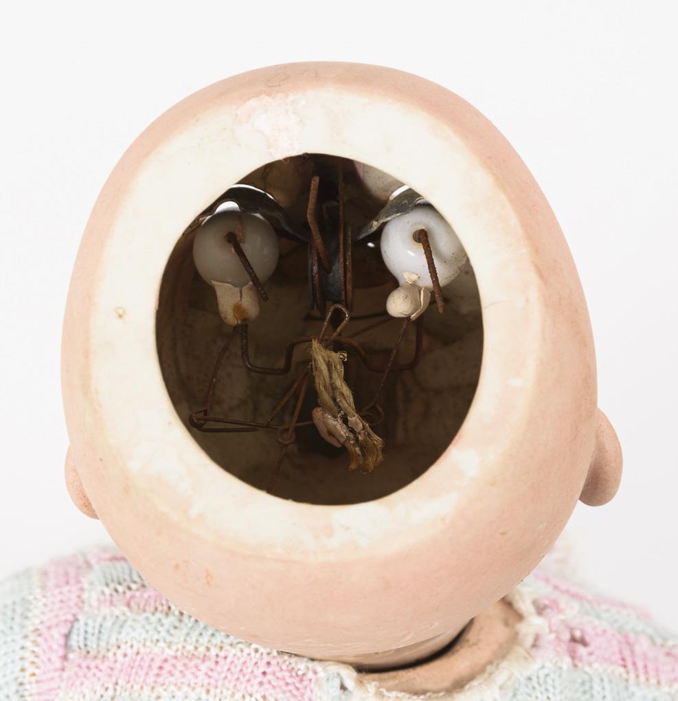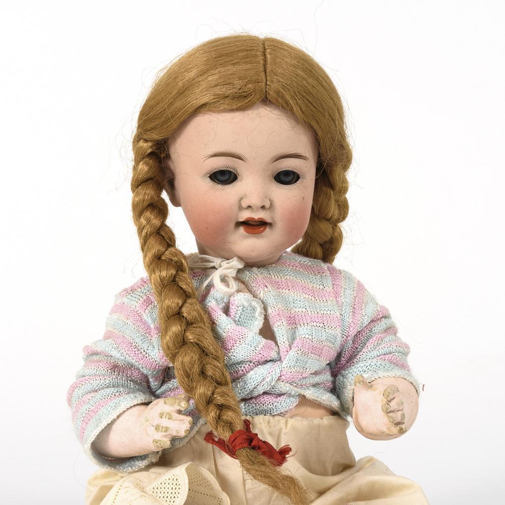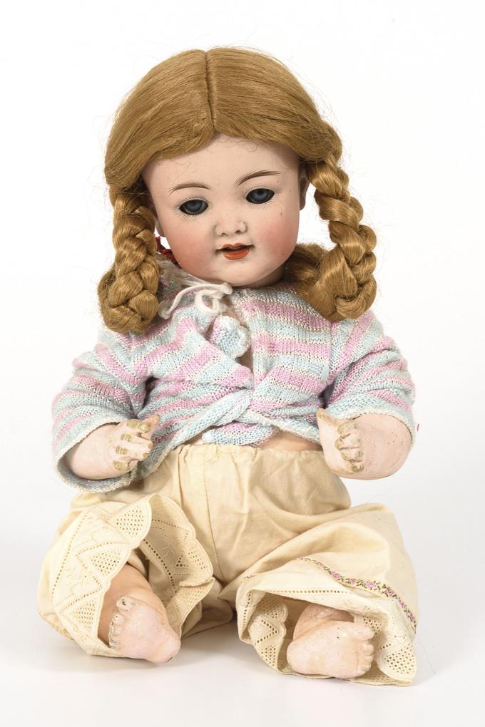 Kurbelkopf, blaue Schlaf-/Schelmenaugen mit Metalllidern, offener Mund mit beweglicher Zunge, blonde Kunsthaarperücke mit Zöpfen. 5-teiliger Sitzbabykörper mit wohl nachträglich eingesetzter, defekter Stimme. Alte weiße Hose, rosa-blau gestreiftes Babyjäckchen jünger. Kopf durchleuchtet: ohne Defekte, Augen etwas tiefliegend. Am Körper Farbdefekte/-risse, Unterarme berieben.
