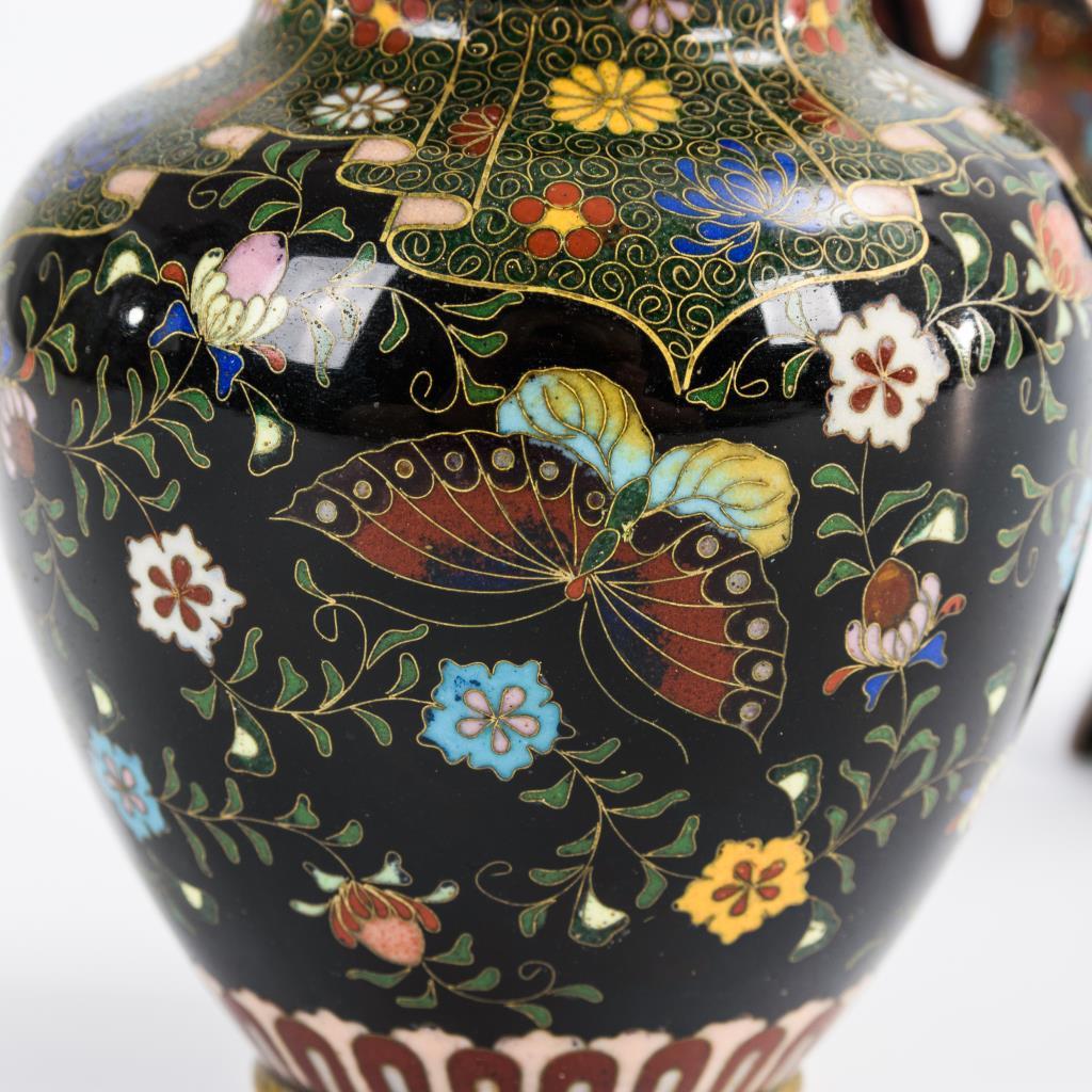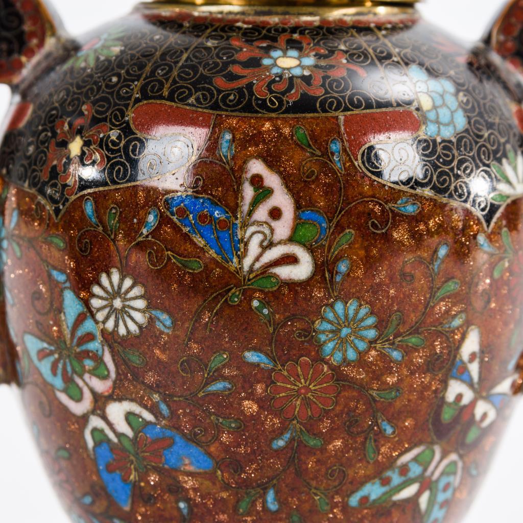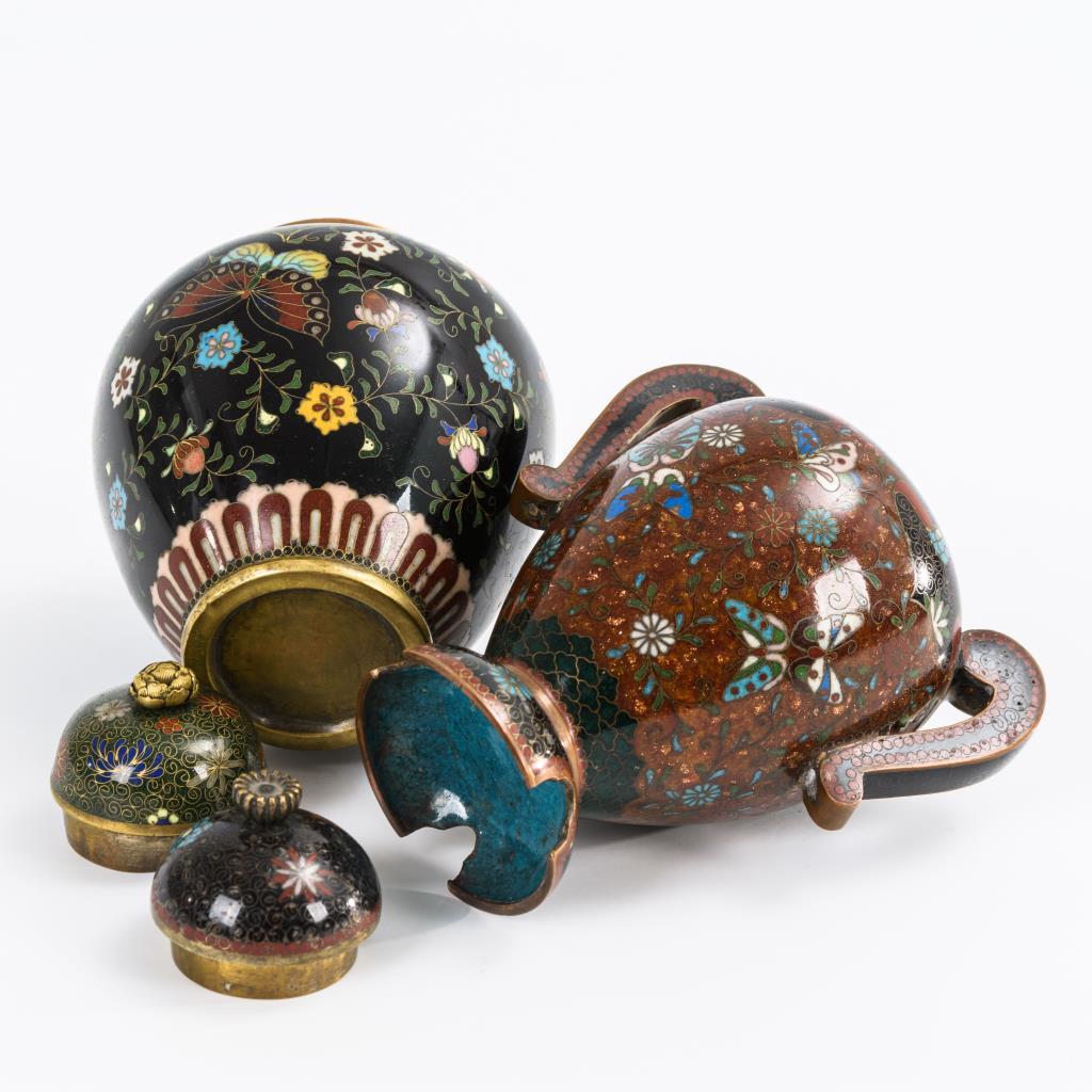 2 sehr fein emaillierte Cloisonné-Deckelvasen