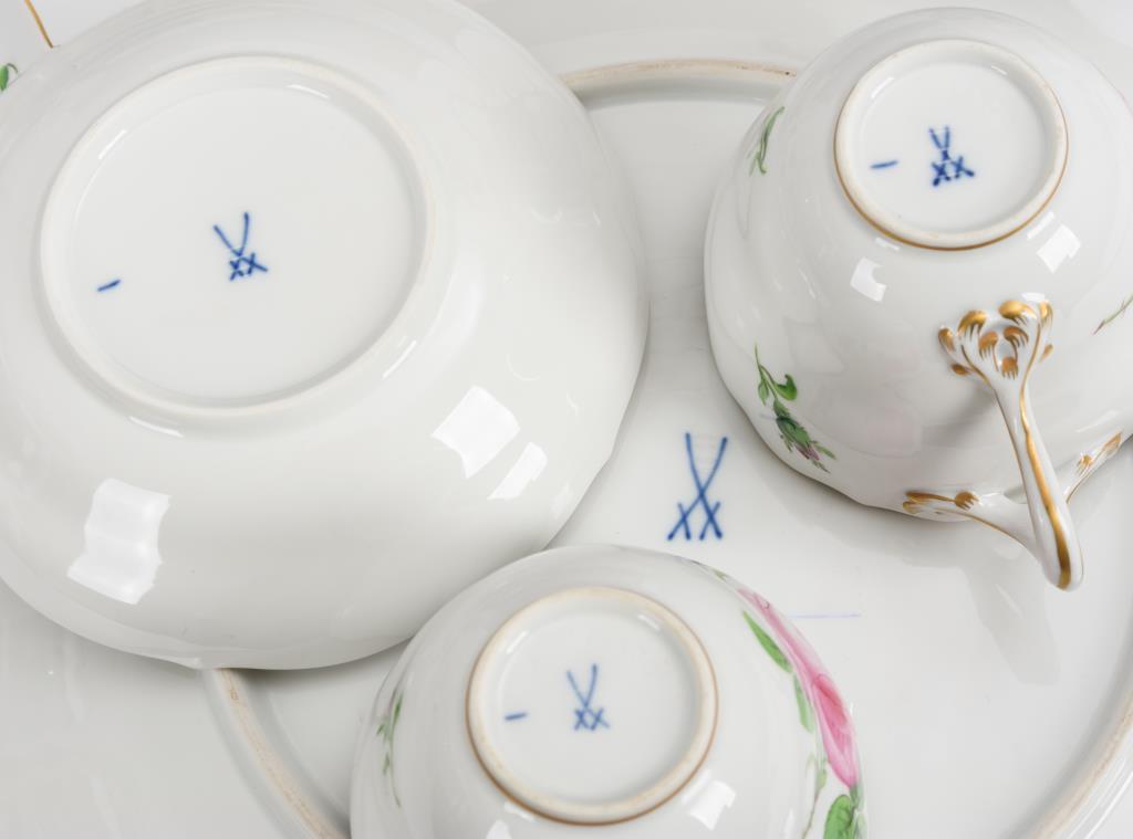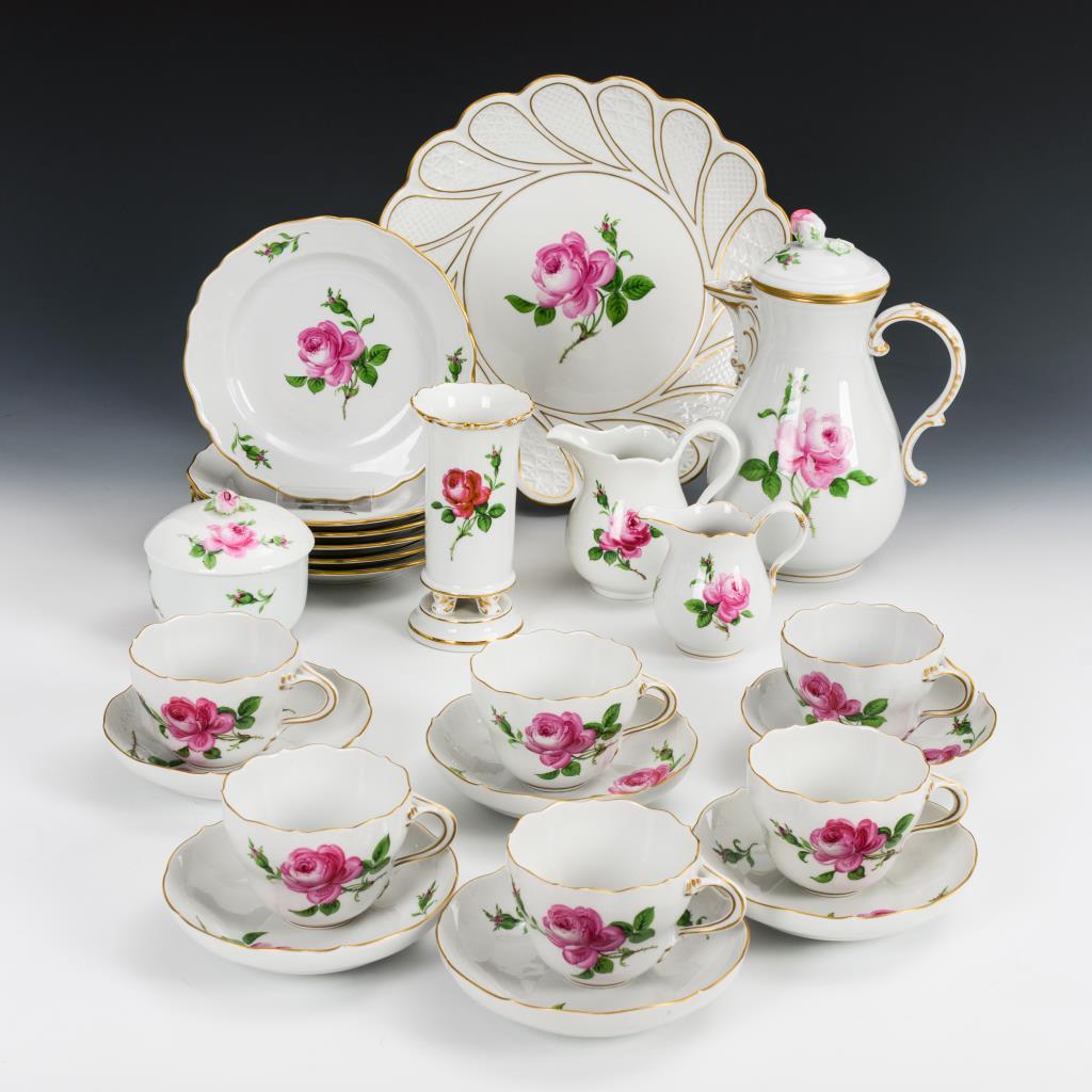 24 Teile. Form "Neuer Ausschnitt". Kaffeekanne (H 23,5 cm), 2 Milchkännchen, Zuckerdose, 6 Kaffeetassen, 6 Untertassen, 6 Kuchenteller, Vase (H 15 cm) und 1 Reliefteller. Rosenknäufe bestoßen.