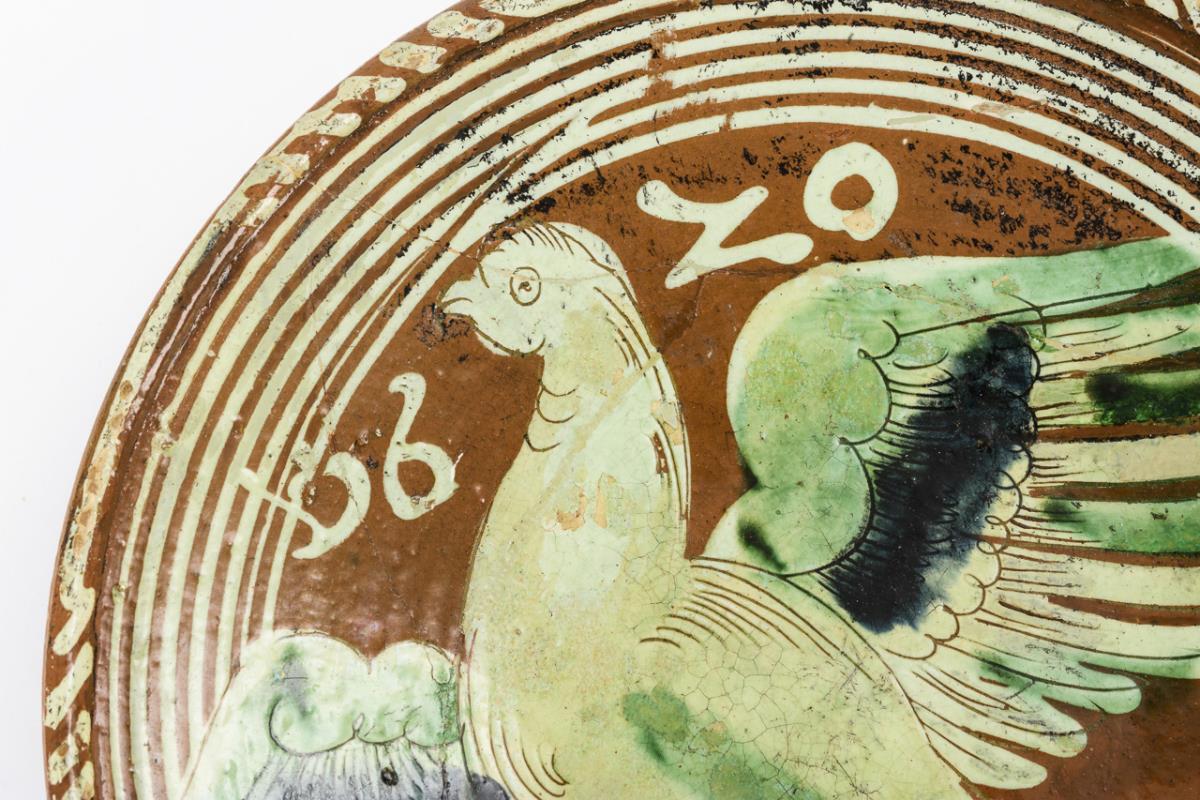 Irdengut, rotbraun engobiert, weiße, grüne und blaue Schlickerbemalung. Ø 24,5 cm.