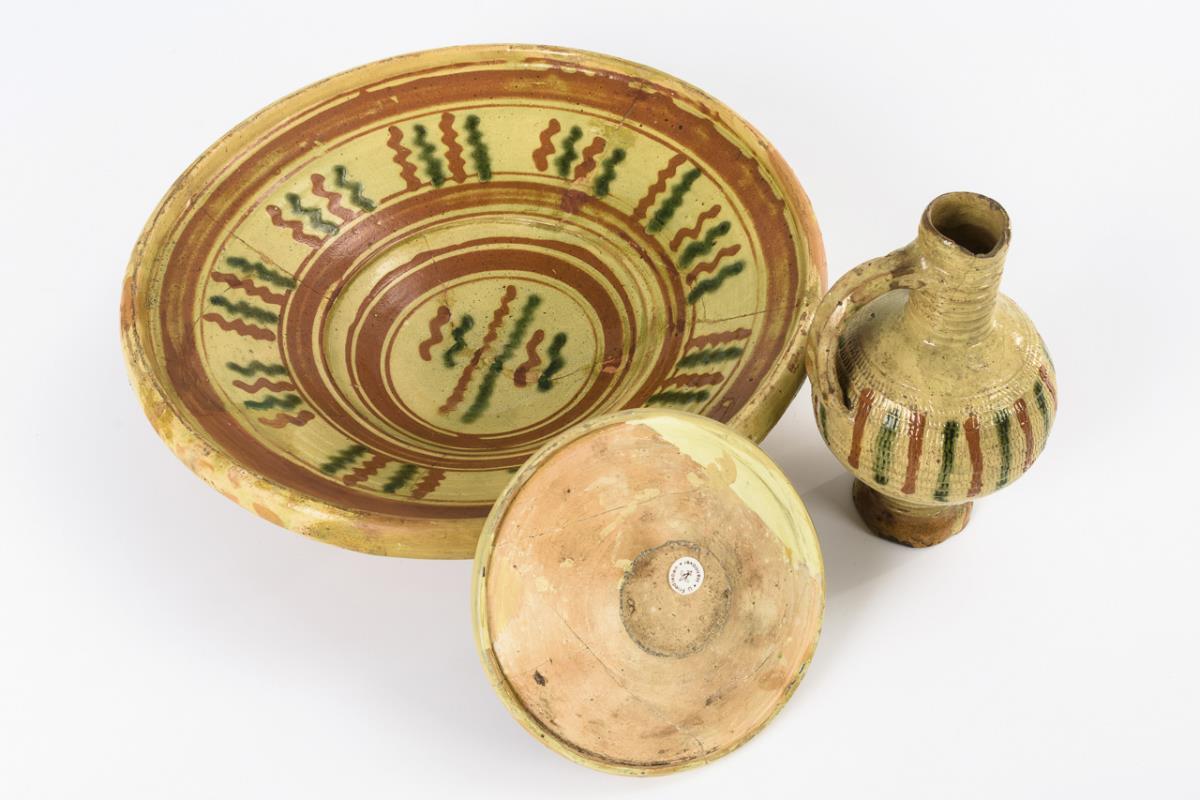 Irdengut, cremefarben engobiert, rotbraune und grüne Schlickerbemalung.