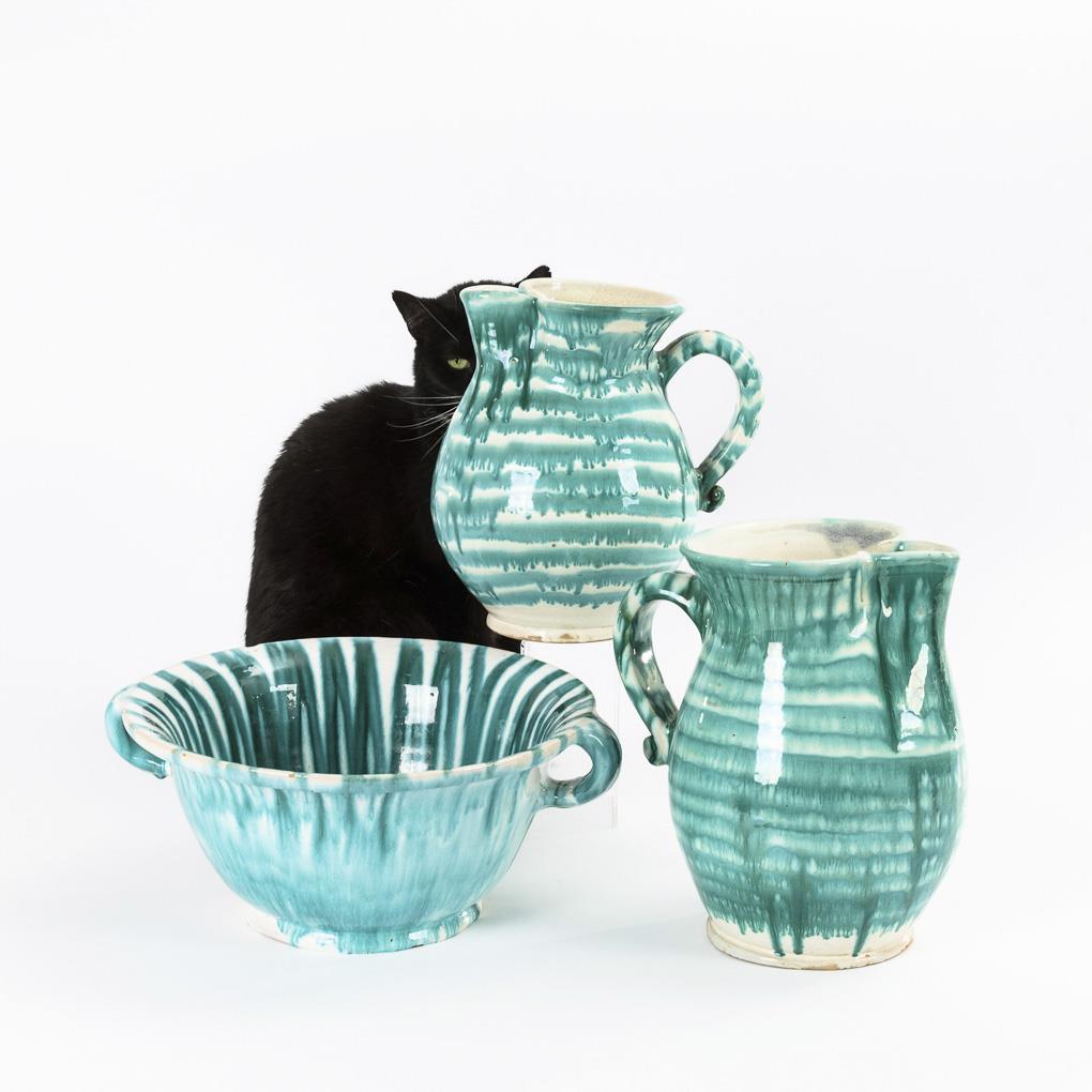 2 bauchige Kannen mit weiter Mündung und gekniffenem Ausguss sowie endvolutiertem Profilhenkel (H 24,5 und 26 cm). Weite Schale mit 2 Henkeln (Ø ca. 30,5 cm). Partiell leicht bestoßen, Schüssel am Boden haarrissig.