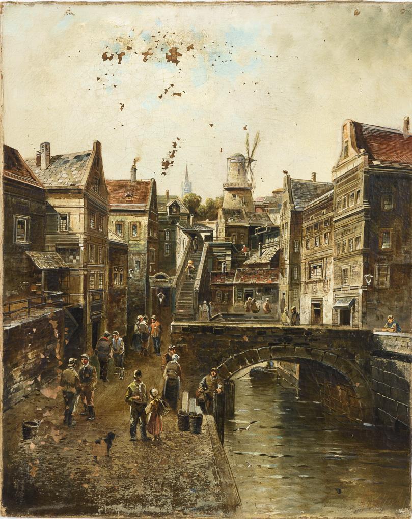 Belebte Straßenszene in der holländischen Stadt an einer Gracht unter bewölktem Himmel. Restaurierungsbedürftig.