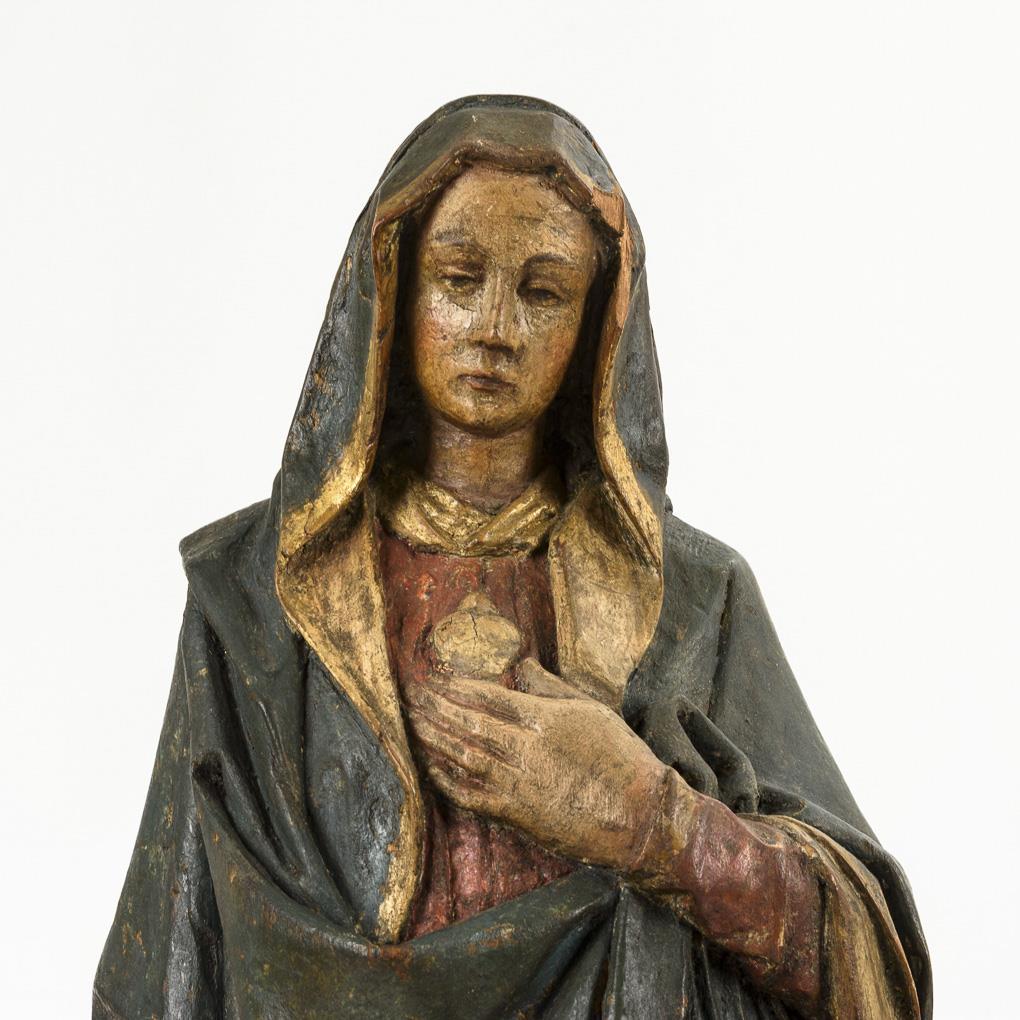Auf der Mondsichel stehende Jungfrau Maria, die sich ans Herz fasst (Unbeflecktes Herz Mariä). 1 Daumen angenagelt, wenige Trockenrisse, geringe Fehlstellen am Gewand, Fassung übergangen, Altersspuren.