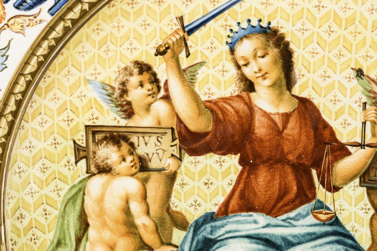 Im Spiegel die Darstellung der Justitia mit Putten, breiter Rand verziert mit historisierendem Dekor mit Rollkartuschen und Mischwesen. Drahtaufhängung. Am Rundstand ein kleiner Brand- und Glasurriss.