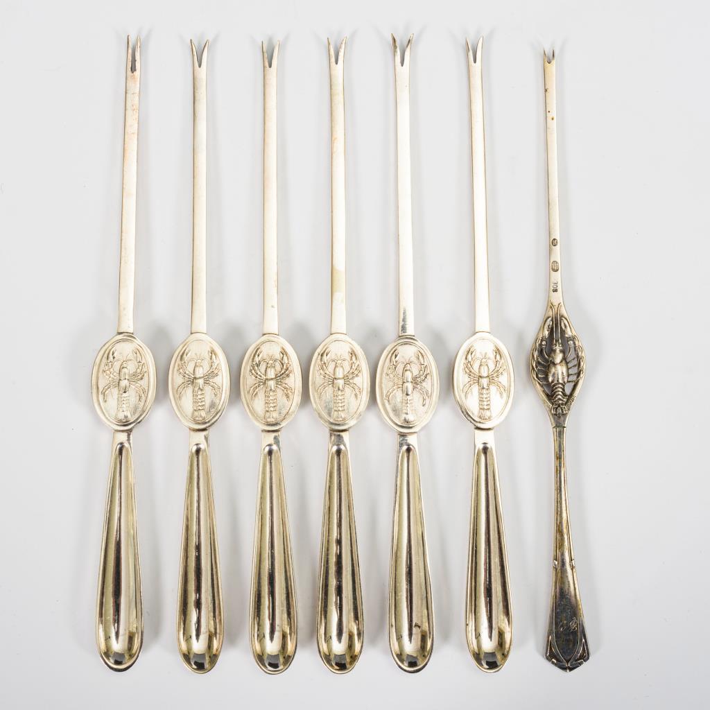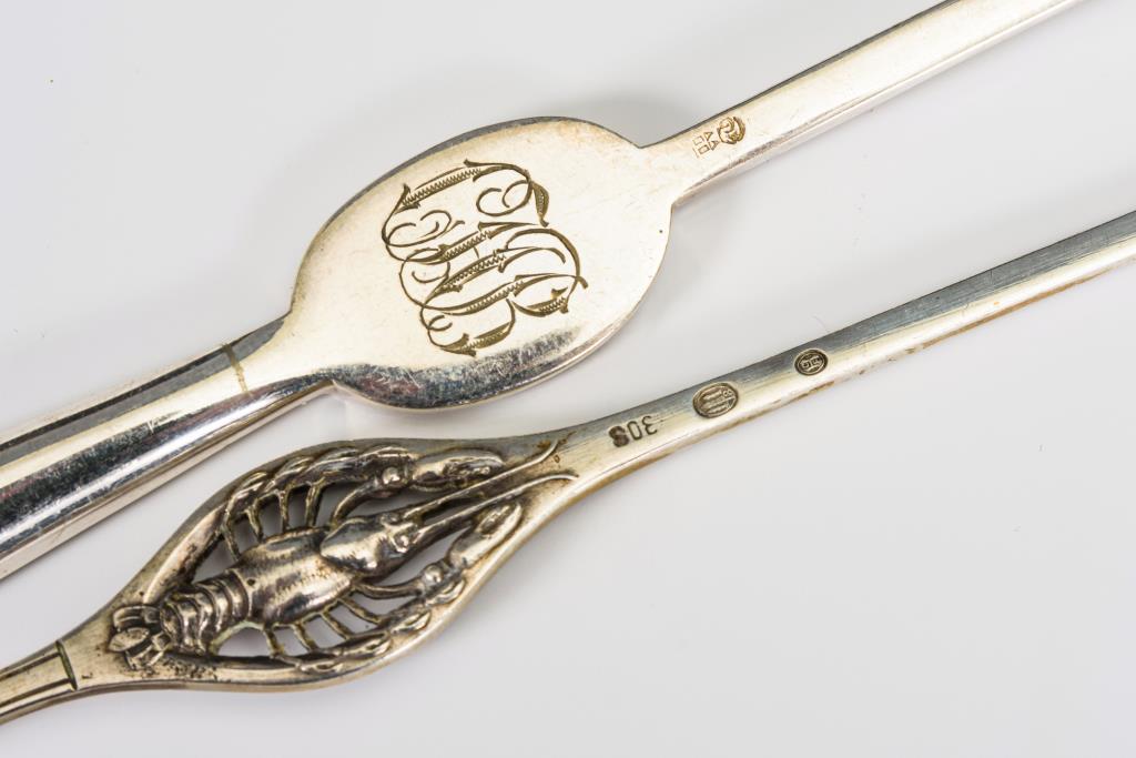 1x Silber mit durchbrochenem Hummermotiv. 6x versilbert mit Ovalmedaillon und Hummer, verso monogrammiert "CHB". Minimale Gebrauchsspuren.