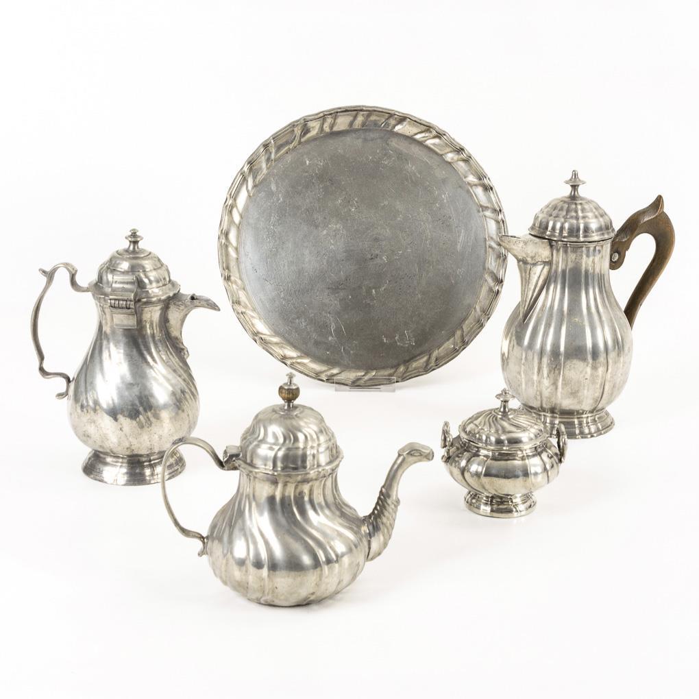 3 Kannen, Zuckerdose und Tablett Zinn.