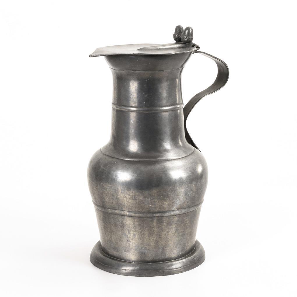 Kölner Kanne mit doppeltem Eichel-Drücker. Scharnierstift ergänzt, Lötreparatur am Deckel, einige Alters-/Gebrauchsspuren.