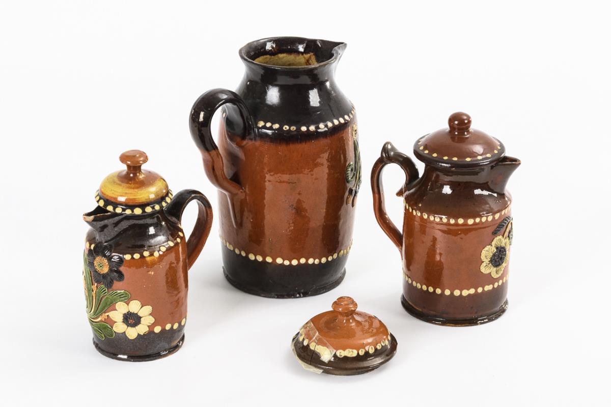 Heller Scherben mit rot- und dunkelbrauner, teils honiggelber Glasur, farbigen, floralen Reliefauflagen und weißem Pünktchendekor. H 17 bis 26 cm.