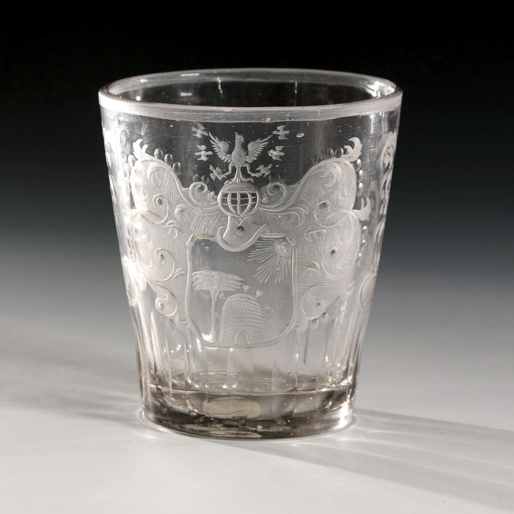 Konischer Becher mit Olivenschliffkranz am Stand. Schauseitig ein graviertes, mit geschliffenen Kugeln verziertes Wappenschild mit Bienenkorb.