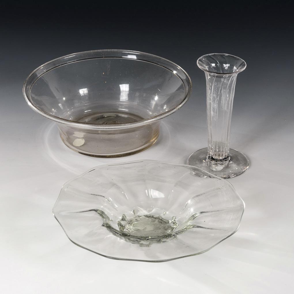 Barocker Teller mit Rippendekor (Ø 19 cm), Kraterschale mit umgeschlagenem Rand (Ø 19 cm) und kleine formgeblasene Vase (H 12,5 cm).