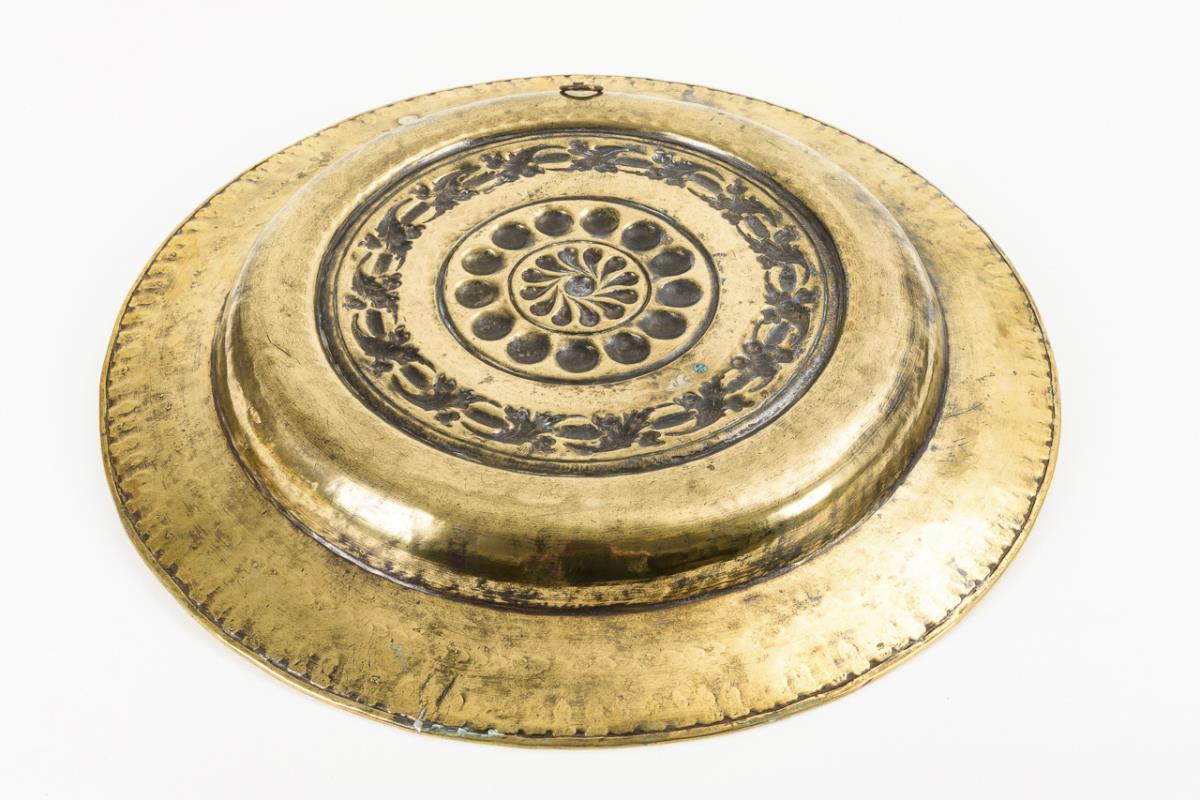 Messing in Form geschlagen und punziert, gebördelter Rand mit Eisendraht. Ø 57 cm.