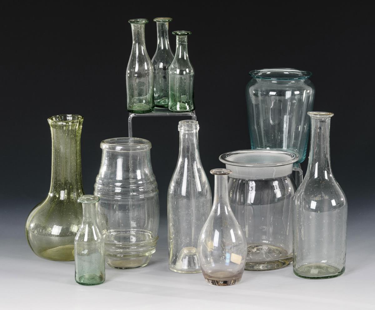 8 verschiedene Flaschen (darunter 4 kleine, grüne Flaschen, 1 ovoide, manganstichige und 1 grüne, längsoptisch geblasene Flasche; H 8,5 - 15 cm). / 3 verschiedene Vorratsgefäße mit ausgestelltem Mündungsrand. 1 kleine Flasche mit Spannungsrissen am Boden; 1 Vorratsgefäß ursprünglich mit Deckel, dieser fehlt.