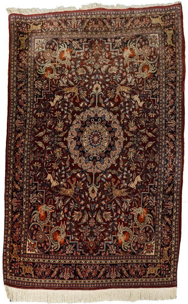 Achtgliedriges Rosettenmedaillon auf reich gemustertem Spiegel mit Vögeln, Hirschen und Raubtieren, Vasenmotiven und verschiedenartigen Blütenzweigen. Mehrreihige Bordüre mit Blumen und Tieren. Leichte Alters- und Gebrauchsspuren.