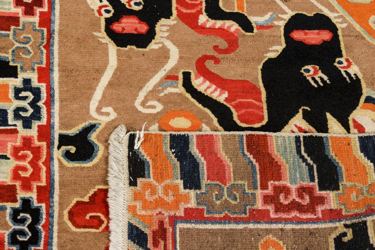 Offenes Mittelfeld mit zwei großen Drachen und begleitenden Wolkenmotiven. Streifenbordüre mit Wolkenband. Leichte Alters- und Gebrauchsspuren.