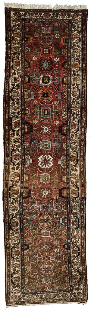 Wolle, handgeknüpft. Polychromdekor. Ca. 111 x 428 cm.