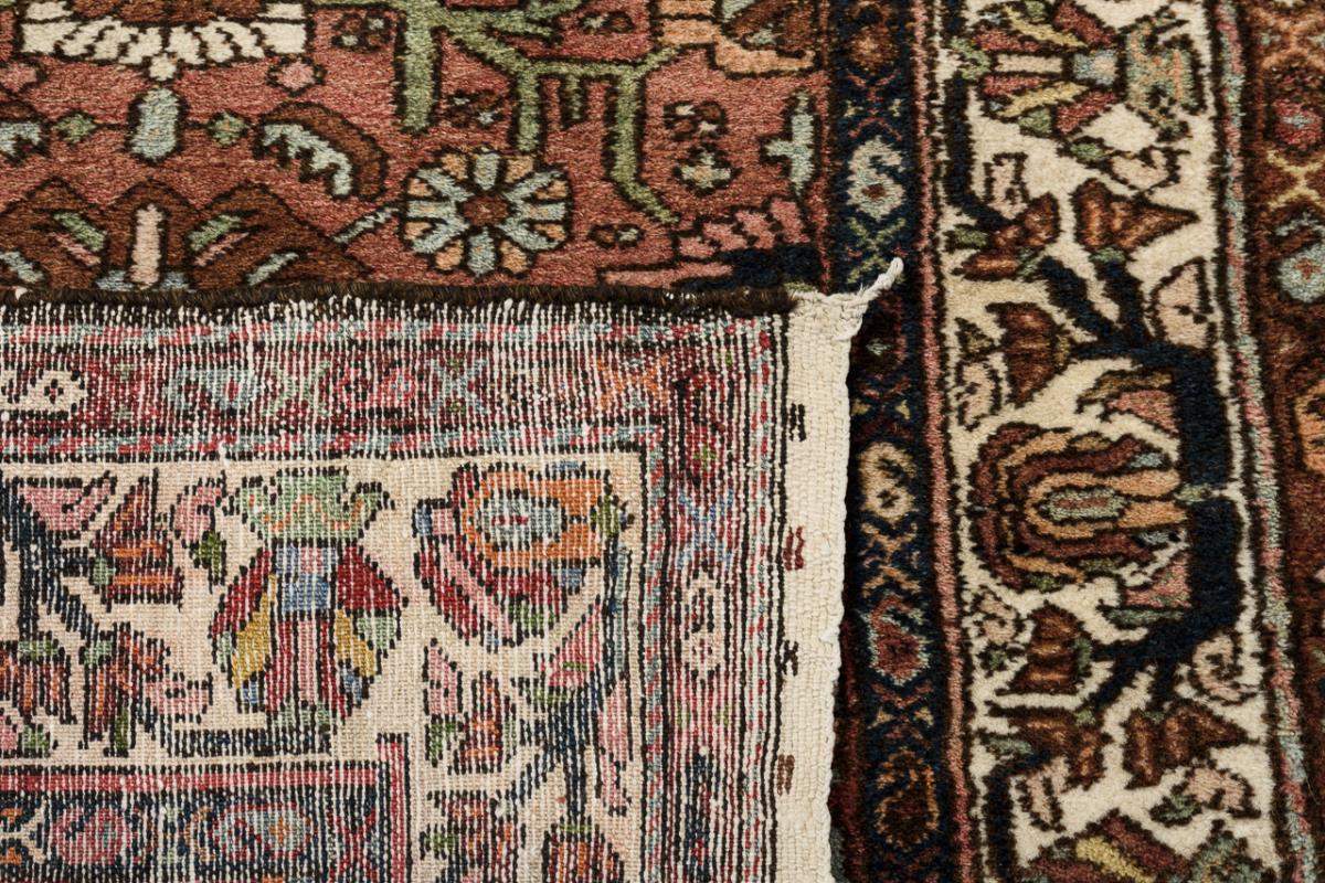 Floral durchgemustertes Mittelfeld mit alternierenden, großen Blüten. Dreireihige Bordüre mit stilisierten Wellenranken und Boteh-Reihen. Alters- und Gebrauchsspuren, partiell leichte Defekte.
