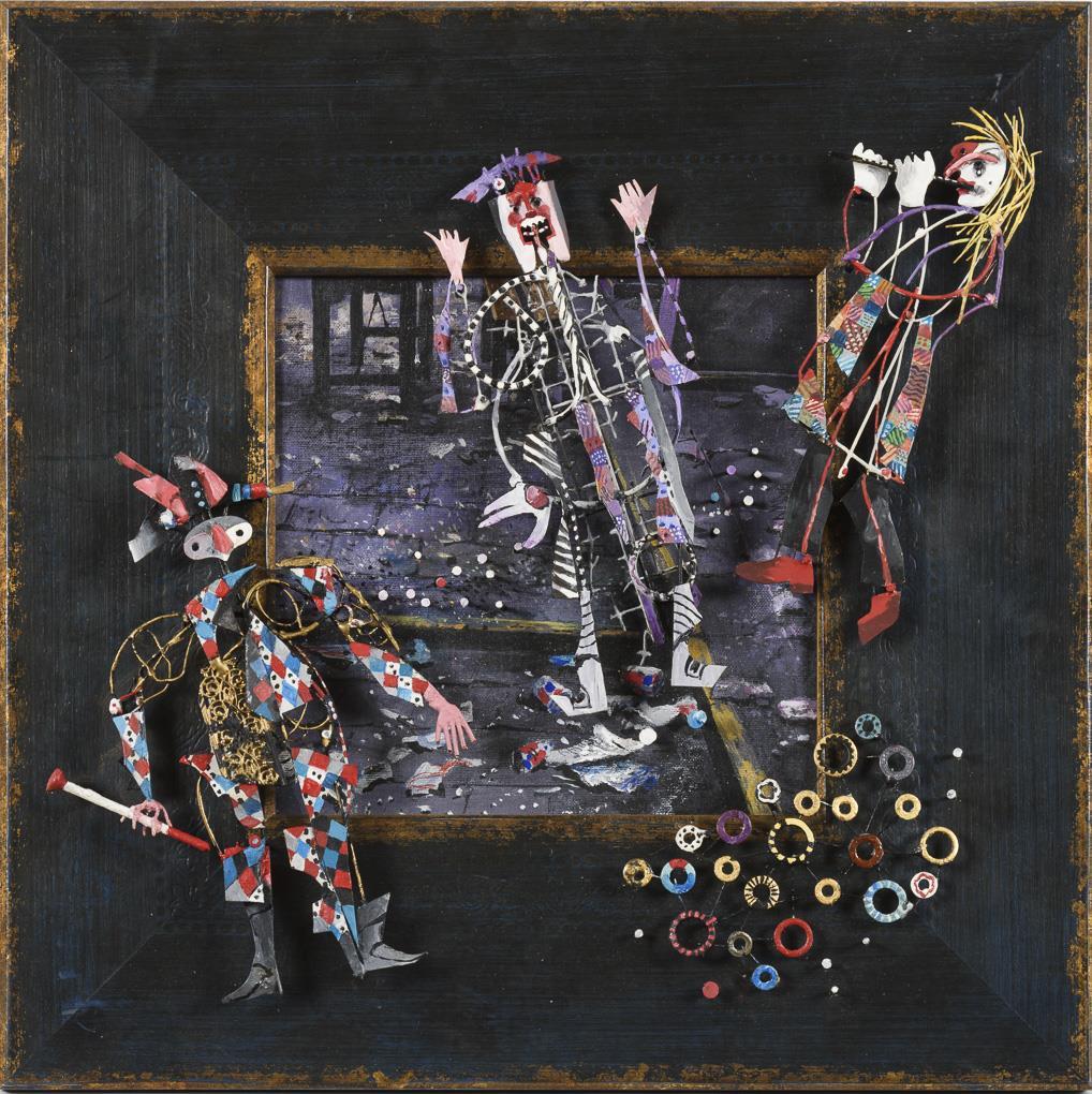 Mischtechnik mit figürlichen Metallapplikationen. Unsigniert.