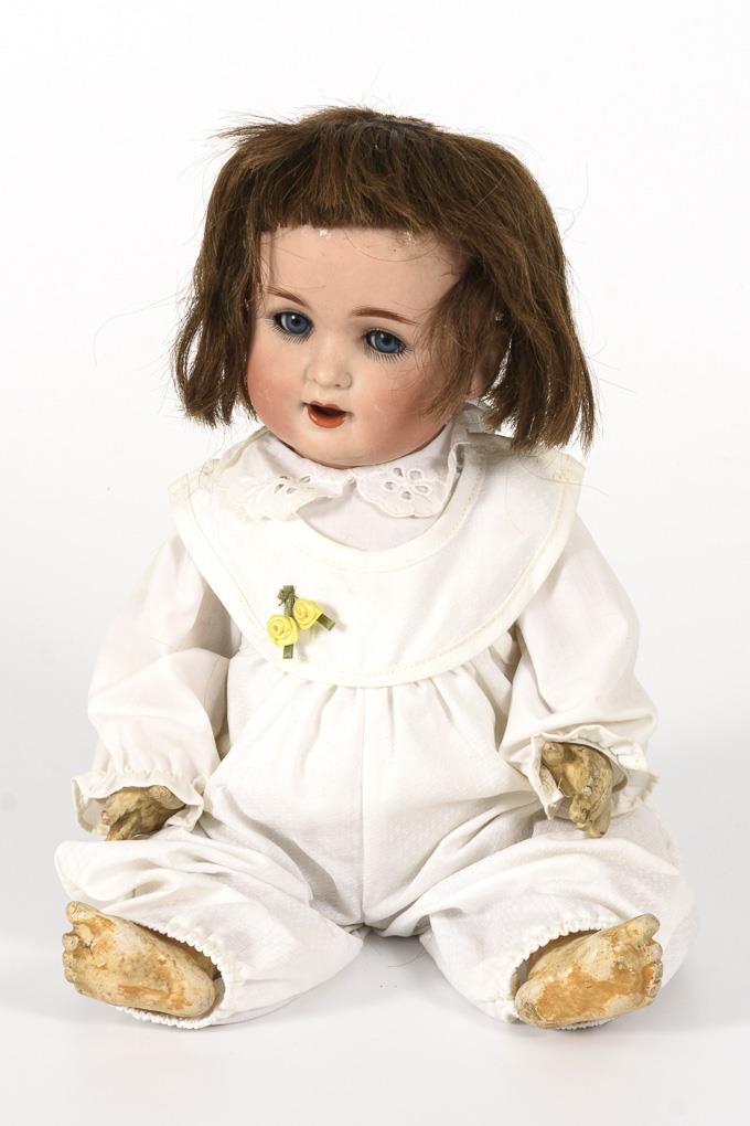 Kurbelkopf, blaue Schlafaugen mit langen Wimpern, braune Echthaarperücke. 4-teiliger Sitzbabykörper mit rotem Stempel "R". Jünger ergänzter, weißer Anzug. Kopf durchleuchtet: ohne Defekte. Körper mit Übermalungen und alt reparierten Farbdefekten.