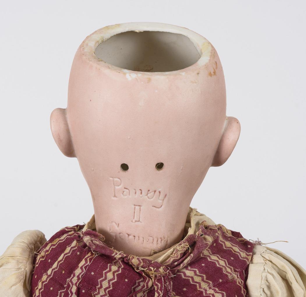 Kurbelkopf, blaue Schlafaugen, dunkelbraune Mohairperücke. 15-teiliger Gliederkörper. Weinrot-weiß gemustertes Kleid, schwarze Schürze, schwarze Samthaube. Kopf durchleuchtet: ohne Defekte. Linkes Auge defekt, Körper übermalt, mit Farbdefekten.