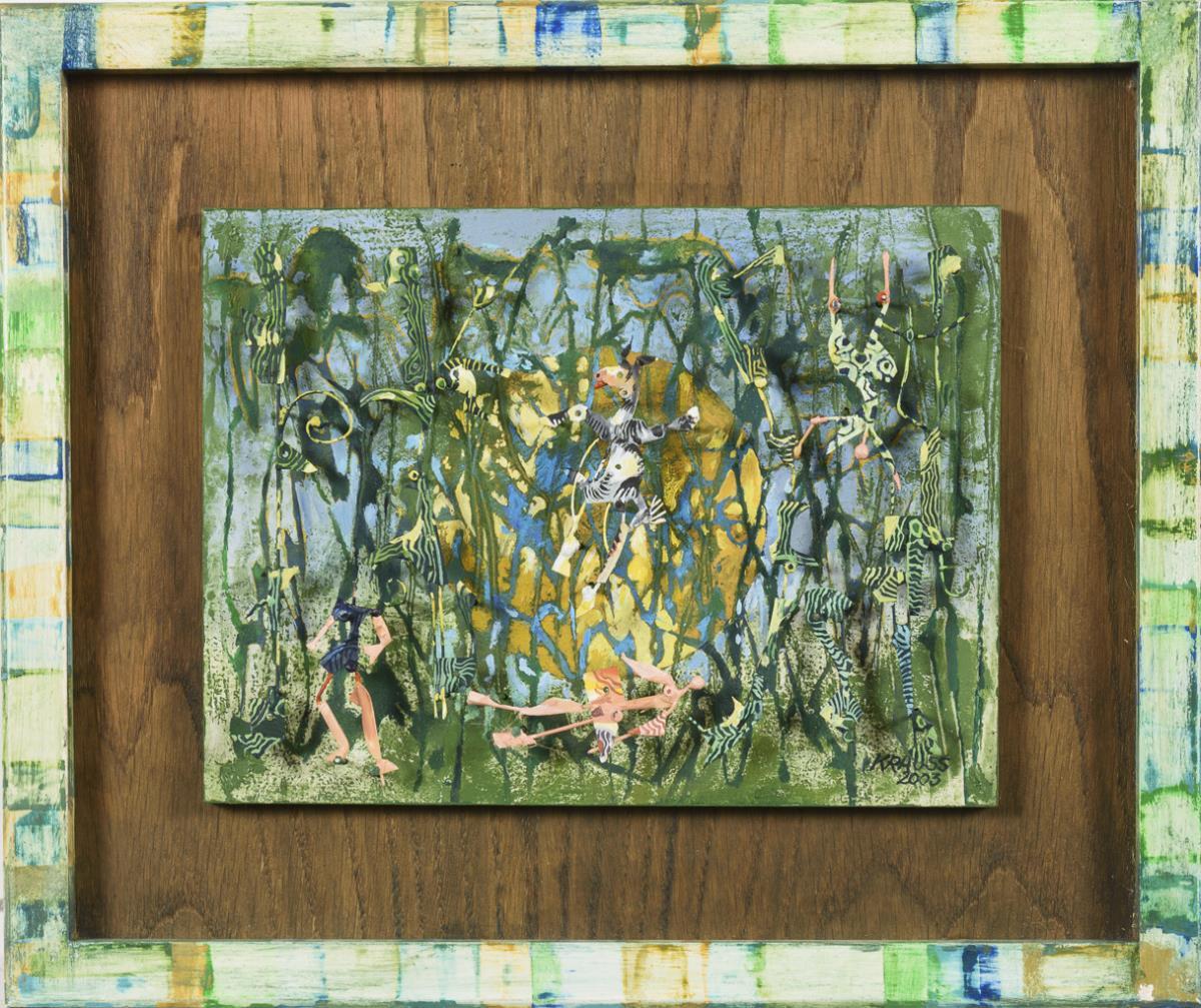 Mischtechnik mit figürlichen Metallapplikationen. Rechts unten signiert, verso bezeichnet/betitelt. Datiert: 2003.