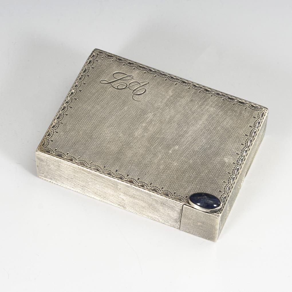 Fein ziselierte Dose mit Lapislazuli-Cabochon als Patentverschluss. Innen facettierter Spiegel und herausziehbare Halterung für Lippenstift. Auf dem Deckel Monogrammgravur "LA". Gebrauchsspuren.